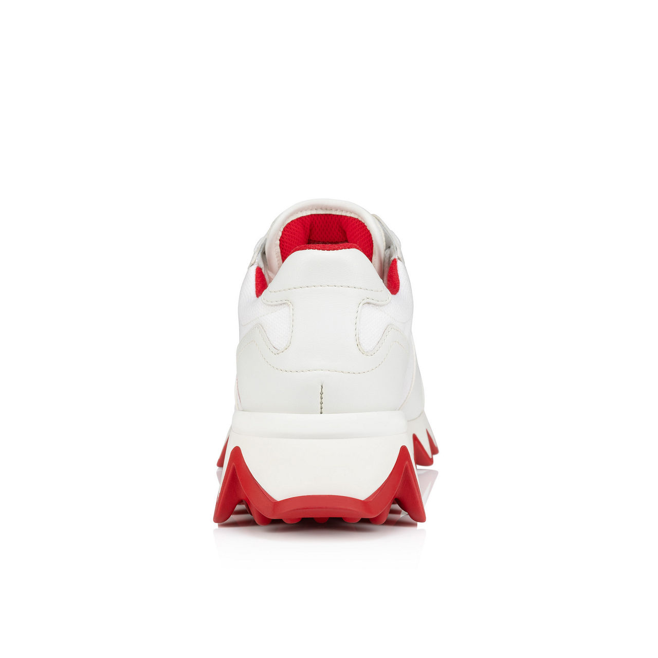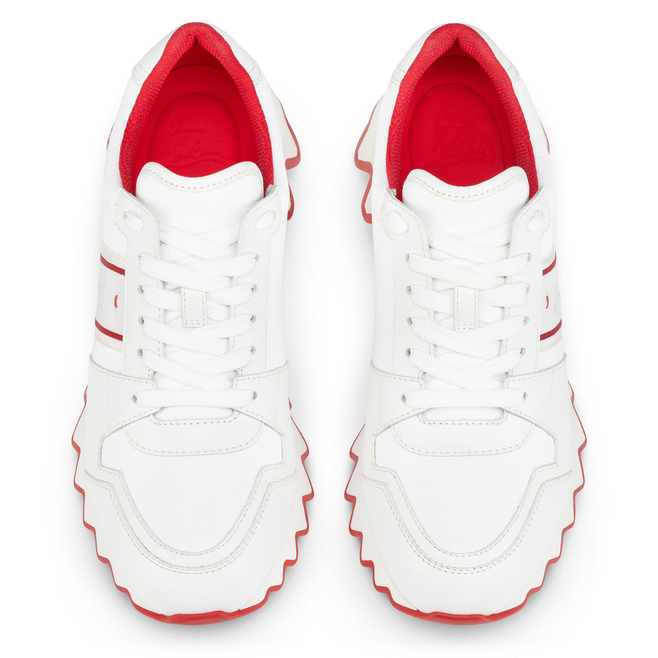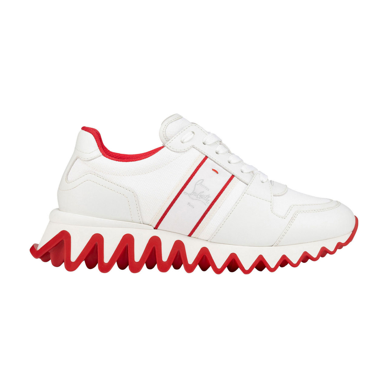 - Almond-shape toe, two-tone zig-zag sole, low-top profile, padded collar, lace-up fastening, contrast panels, signature three-color ribbon detail, signature branded red sole