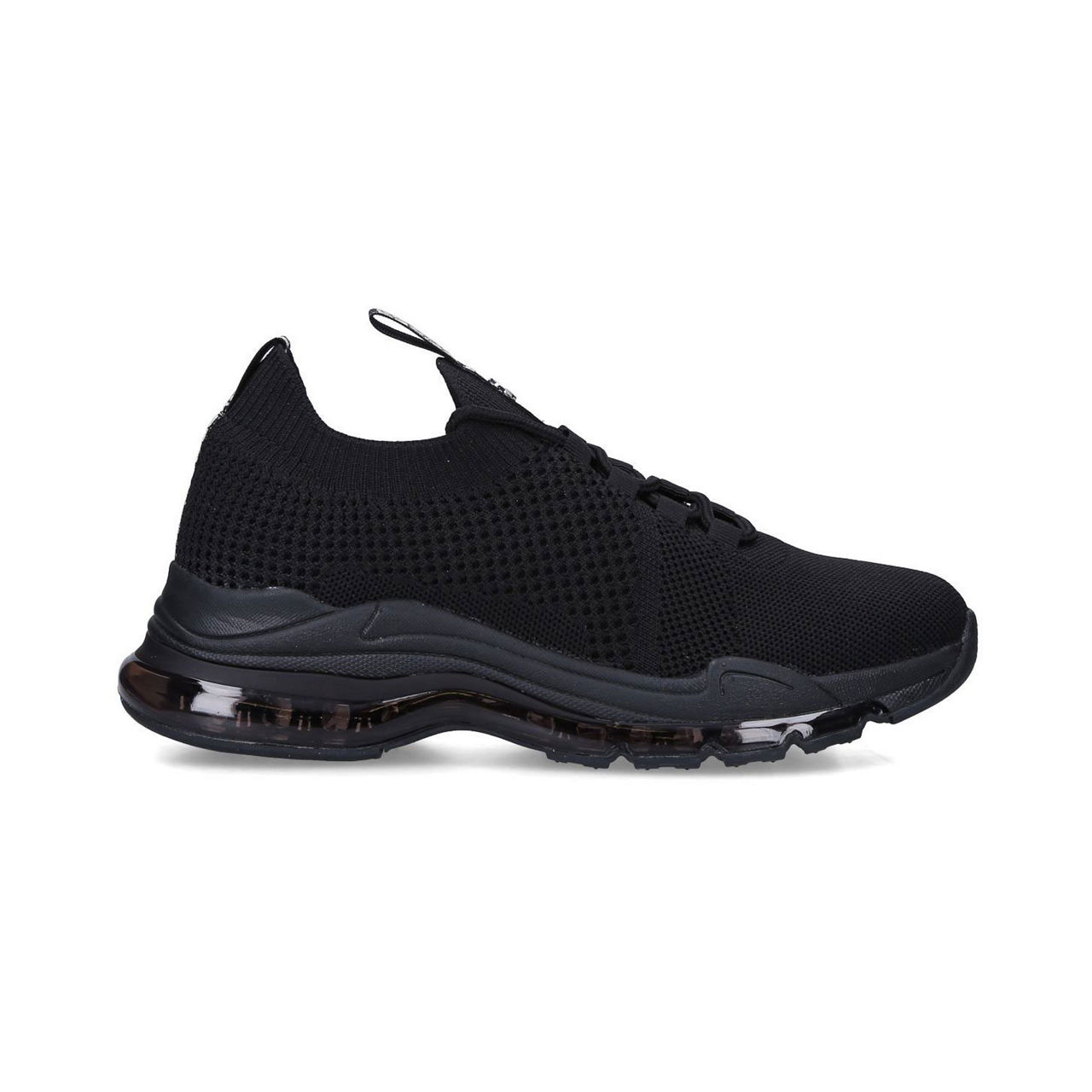 - Slip on style, lace detail, treaded sole, knit upper.