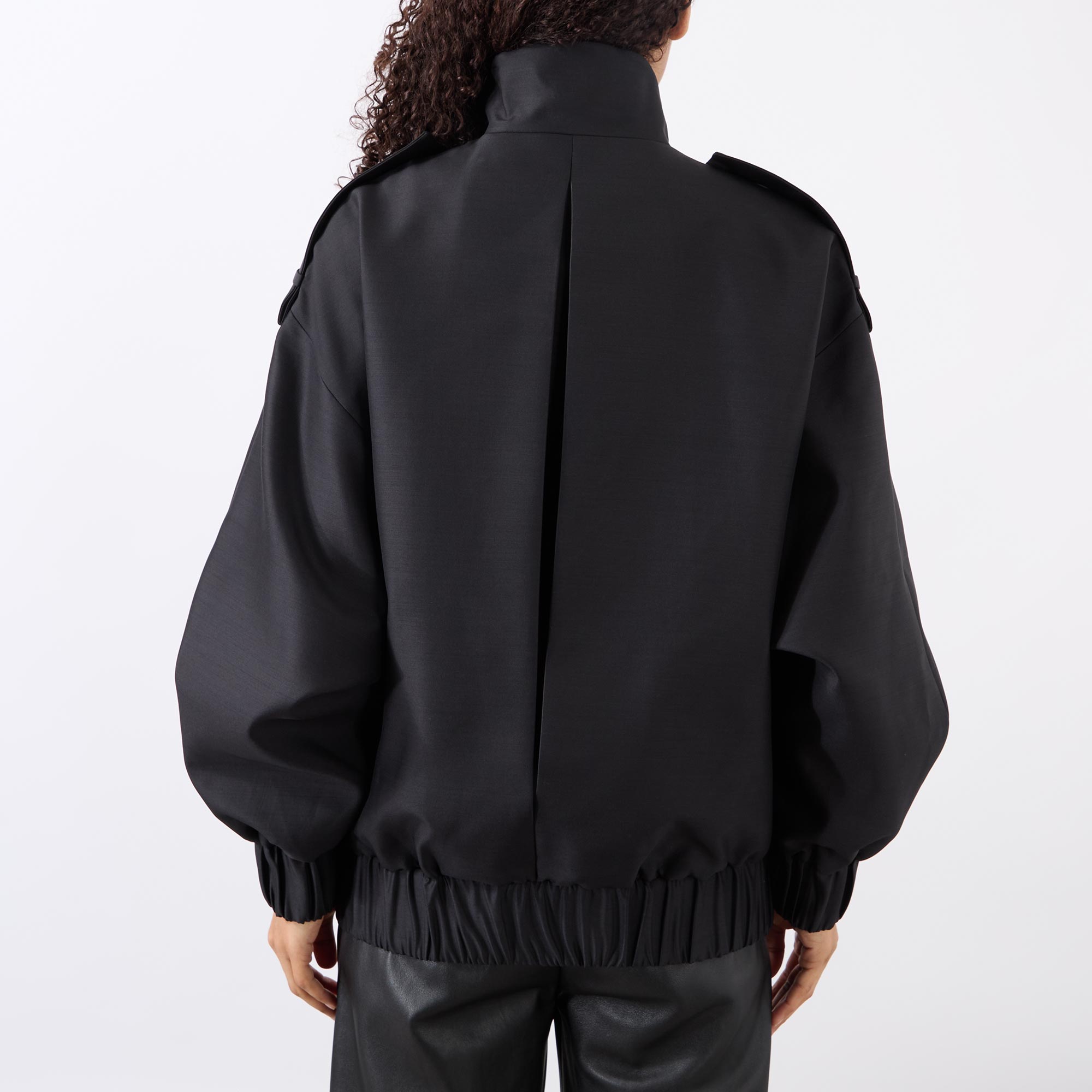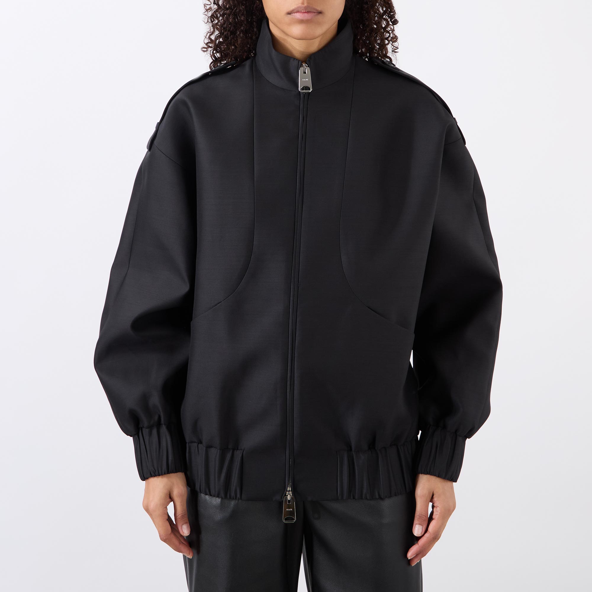 - High neckline, two-way zip fastening, textured faille fabric, elasticated trims, side pockets, lined, epaulette details