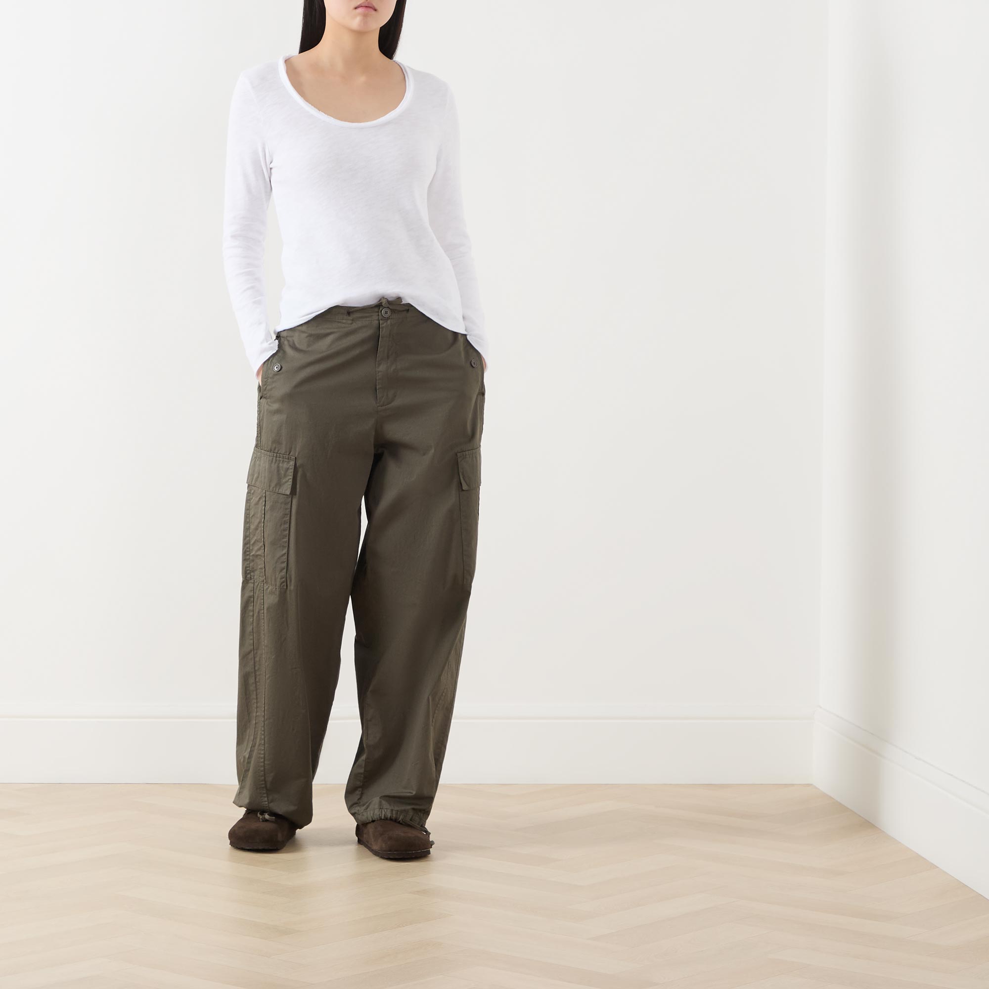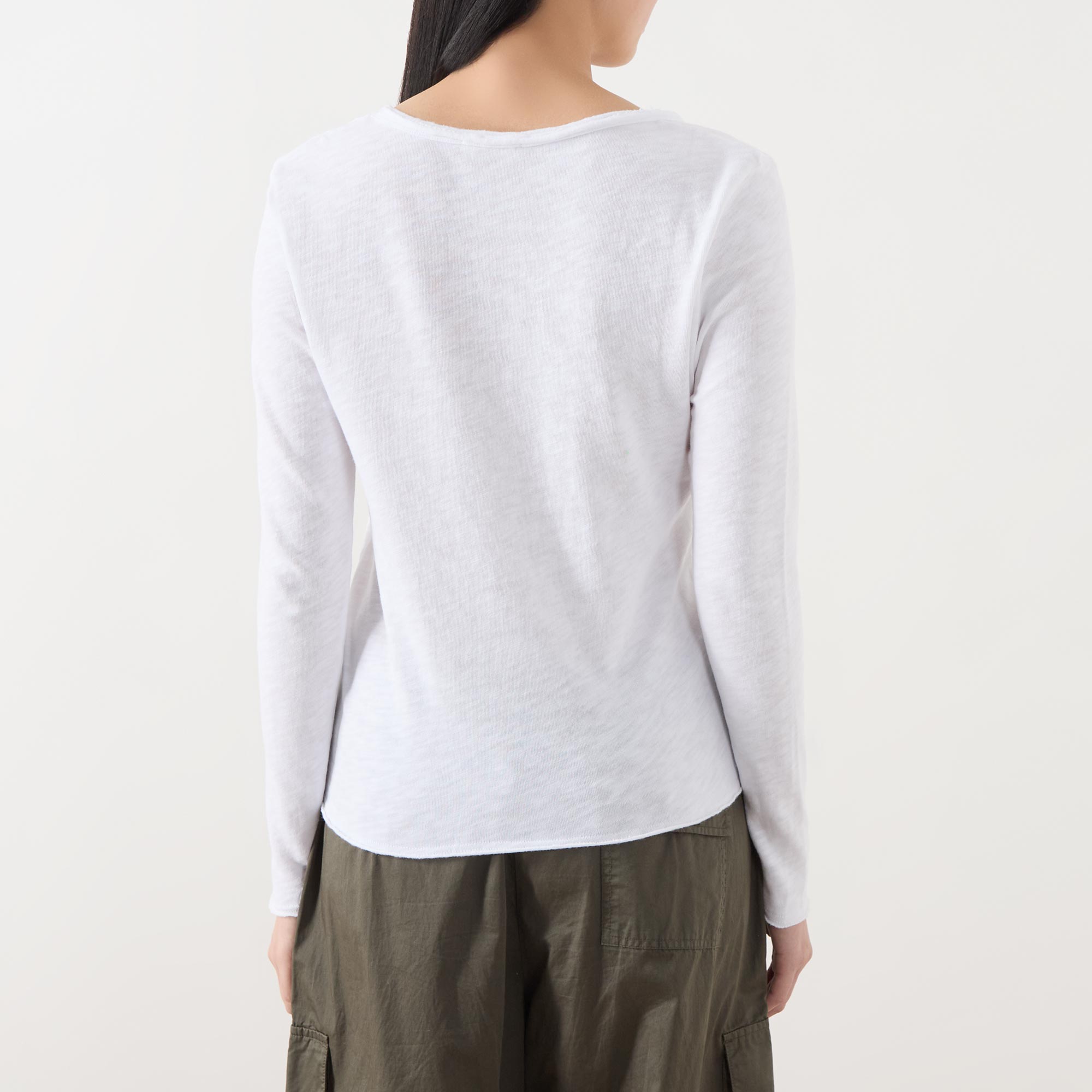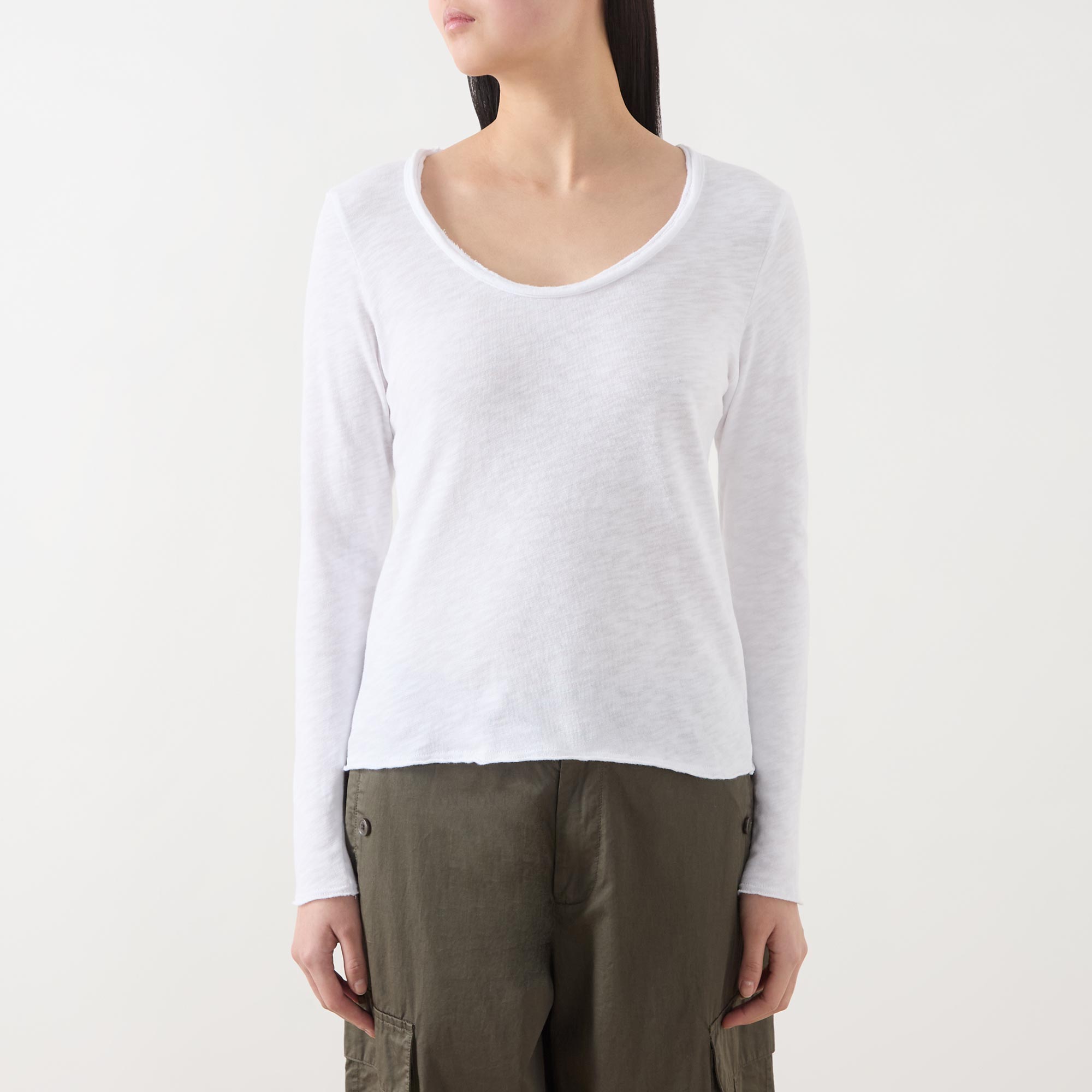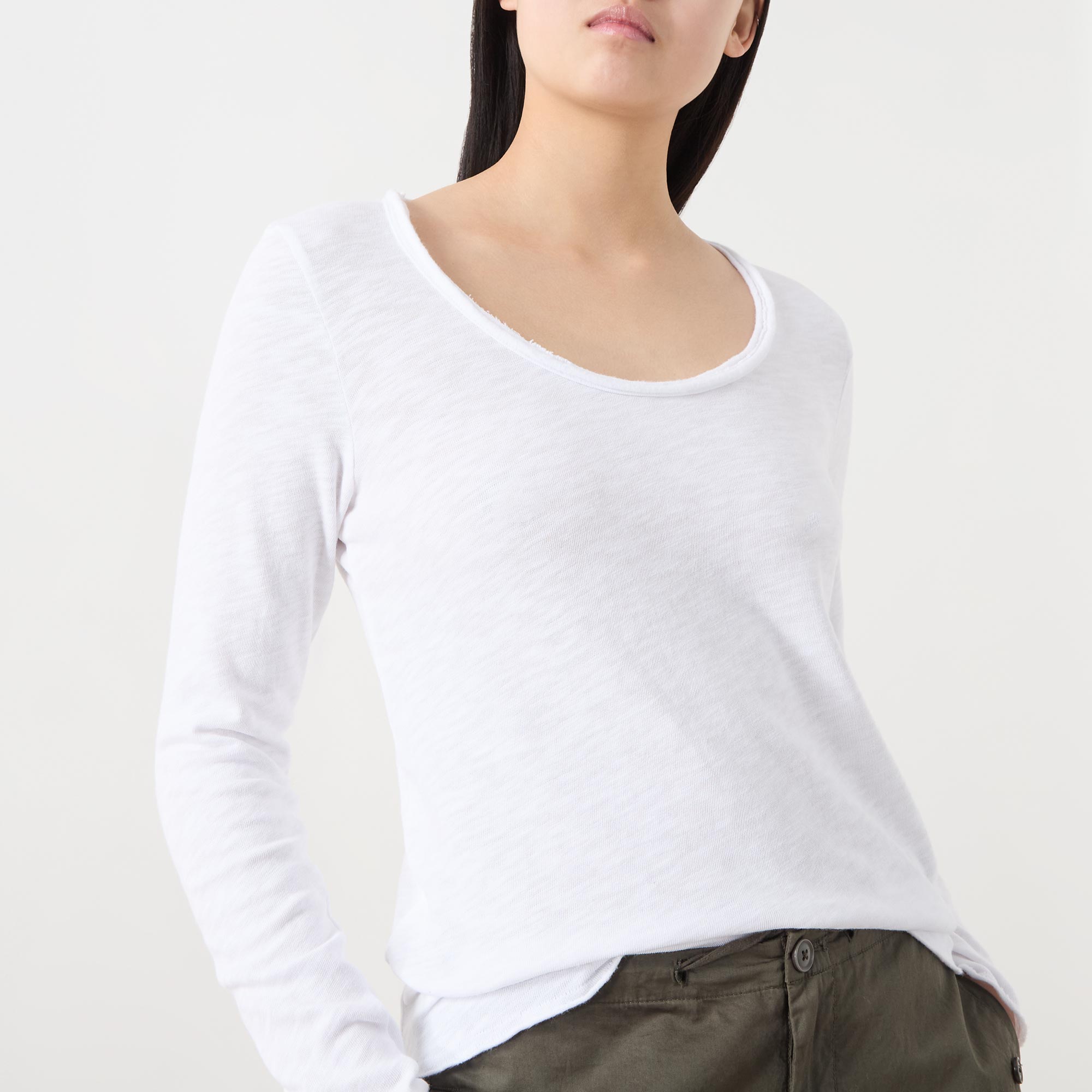 - Scoop neckline, long sleeves, straight hem, tonal stitching, slub textured finish