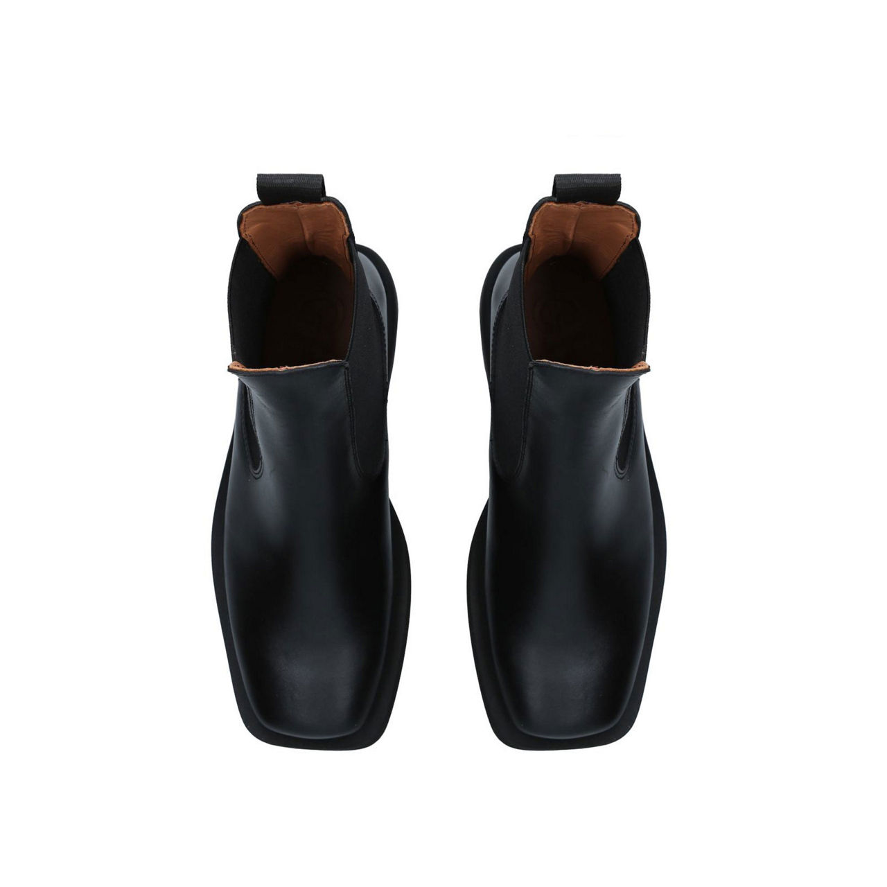 - Ankle boots, smooth finish, low block heel, chunky square toe, wide welts, Chelsea-style elastic panels, branding.