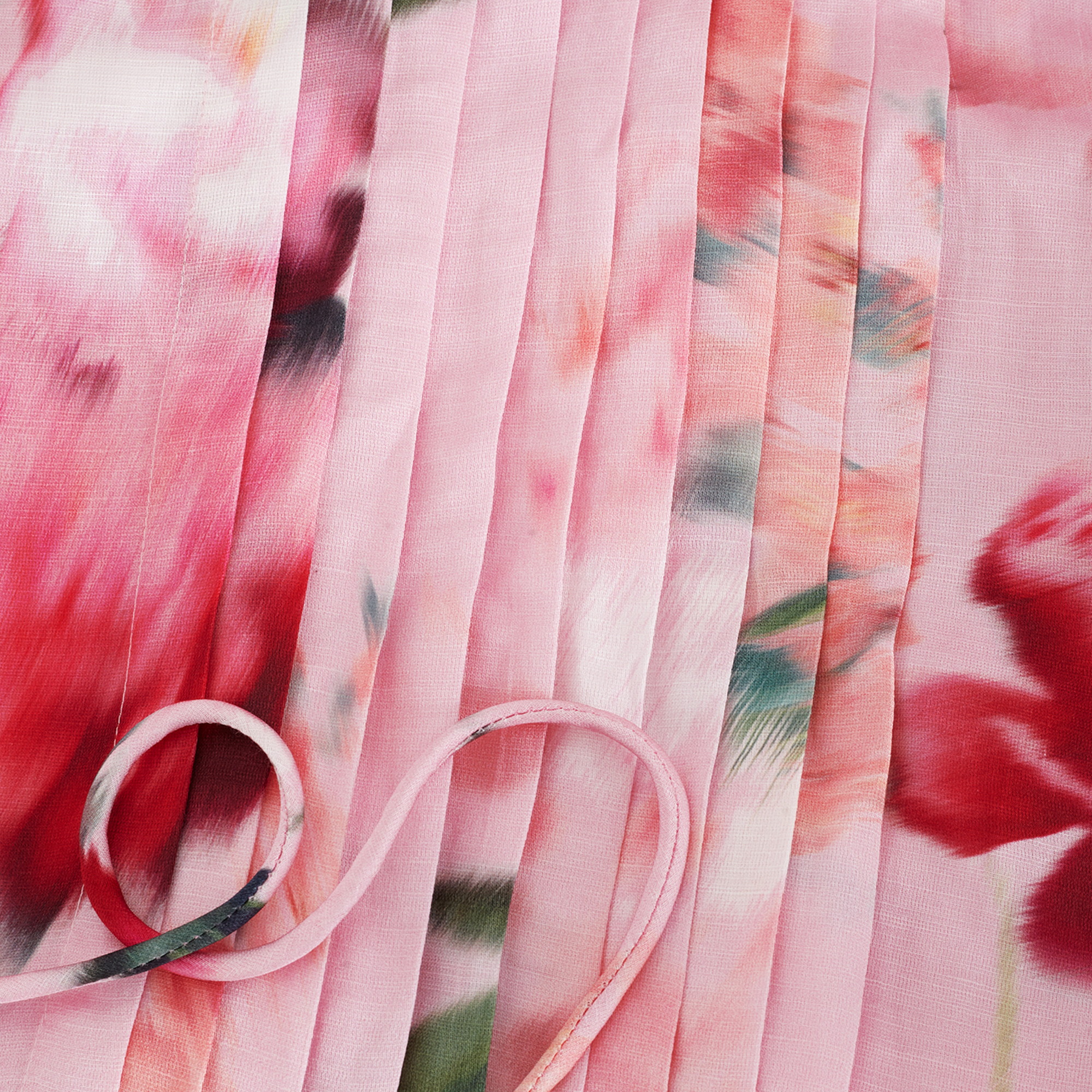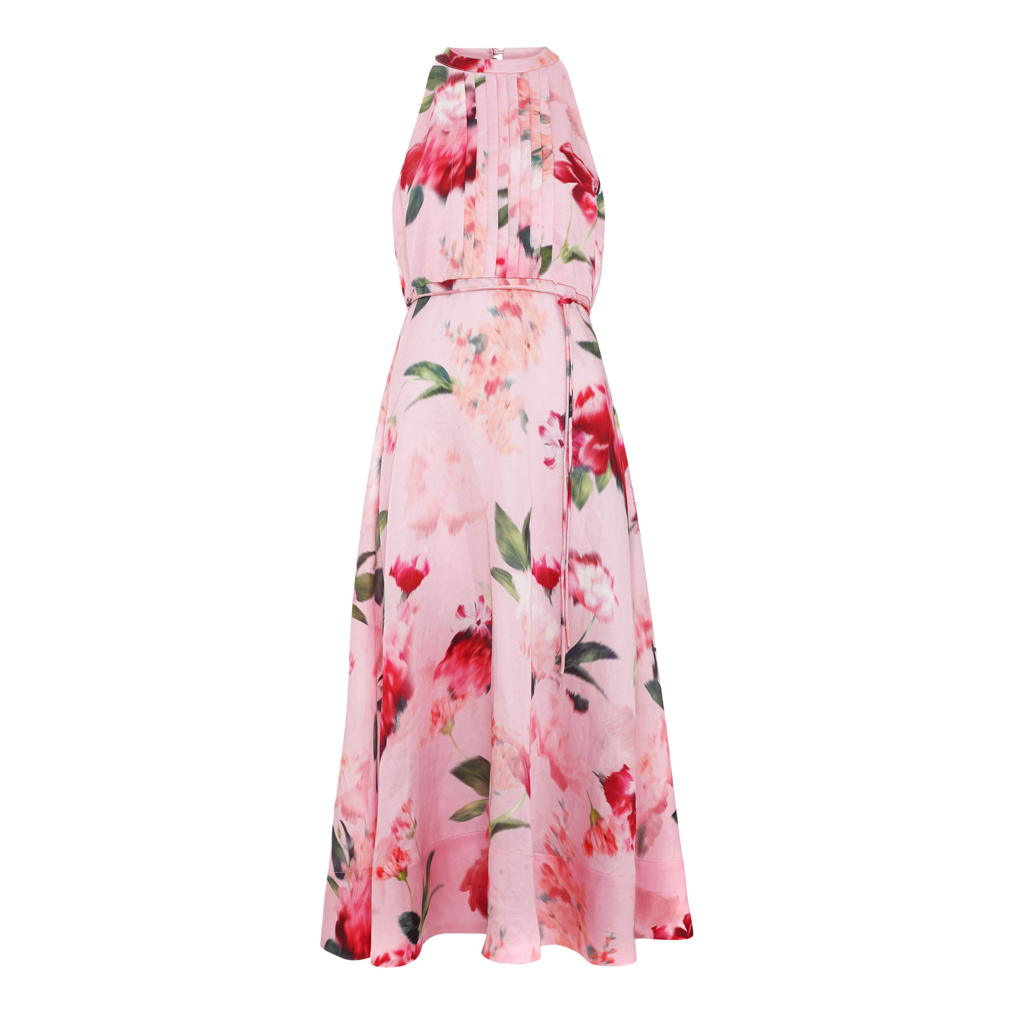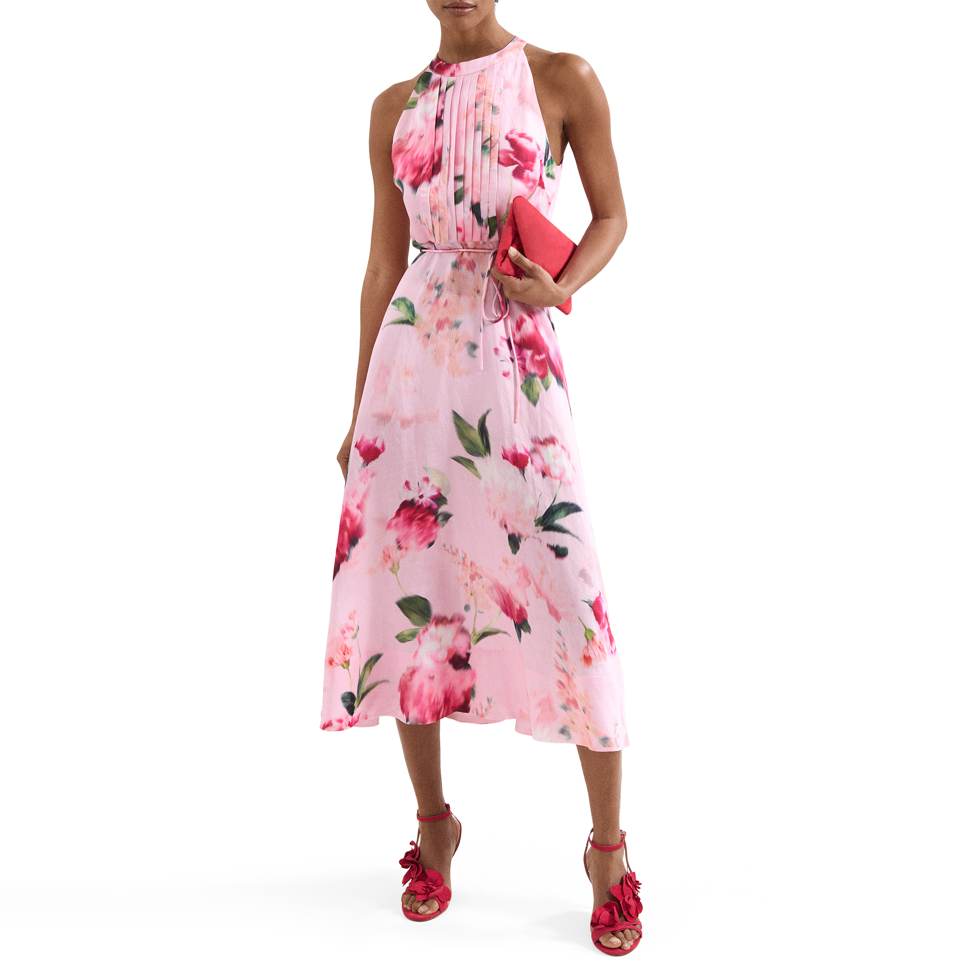 - Halter neckline, sleeveless design, ruched bodice, tie belt detail, floral print, midi length