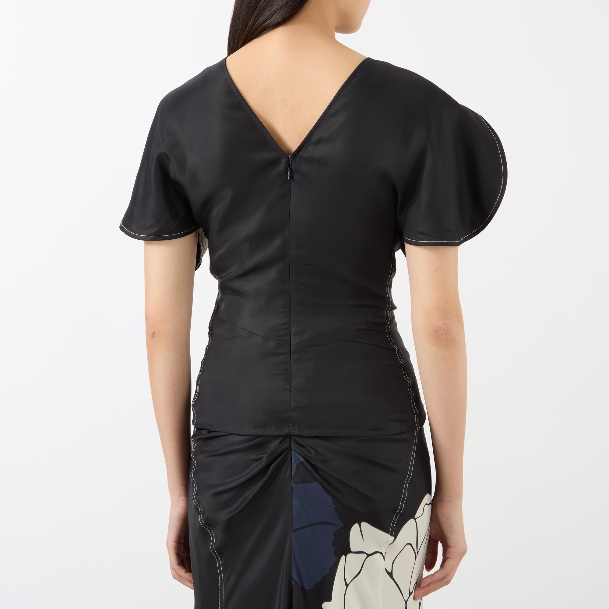 - Round neck, short split sleeves, V-shaped back, rear zip fastening, fitted through the waist, draped design, enlarged floral print throughout