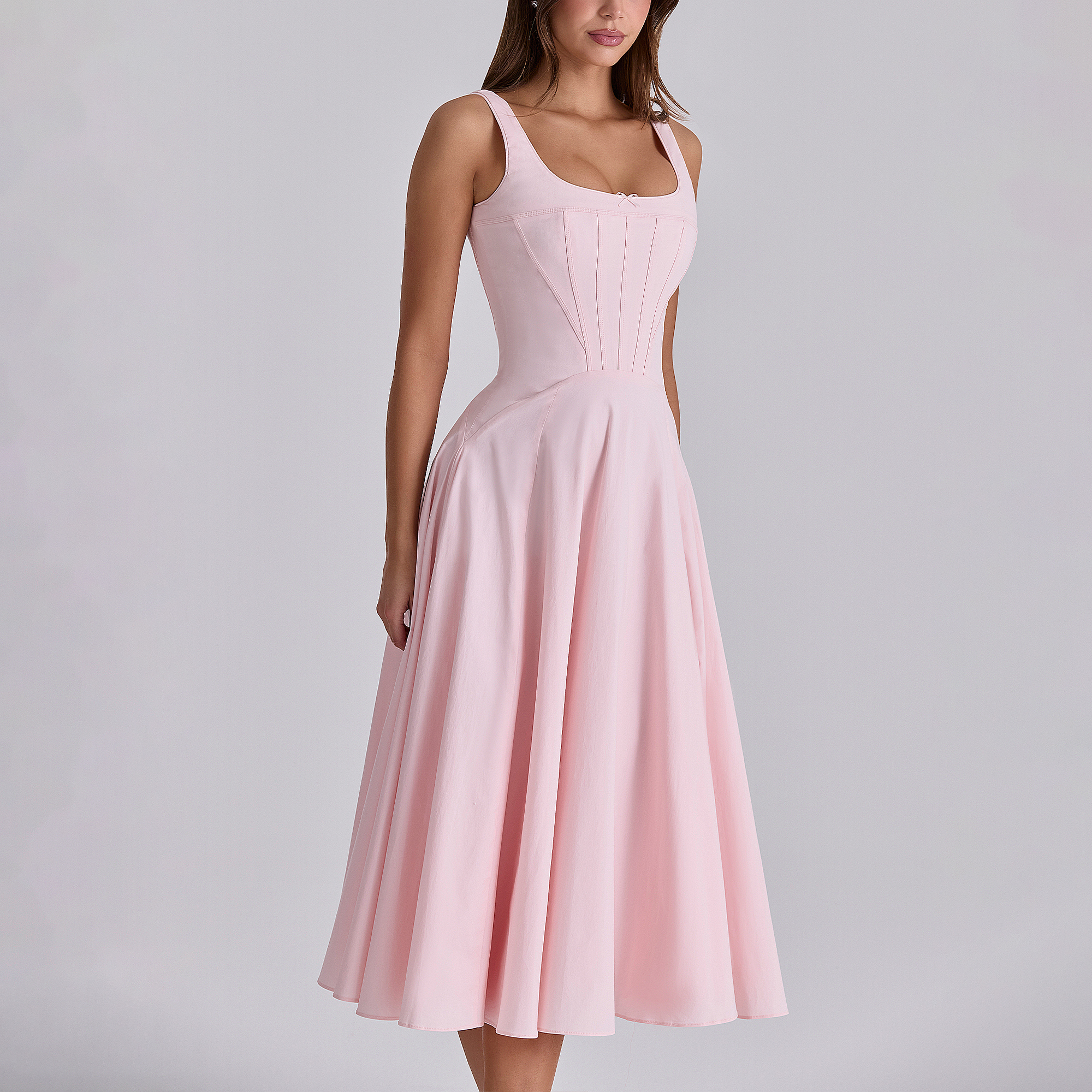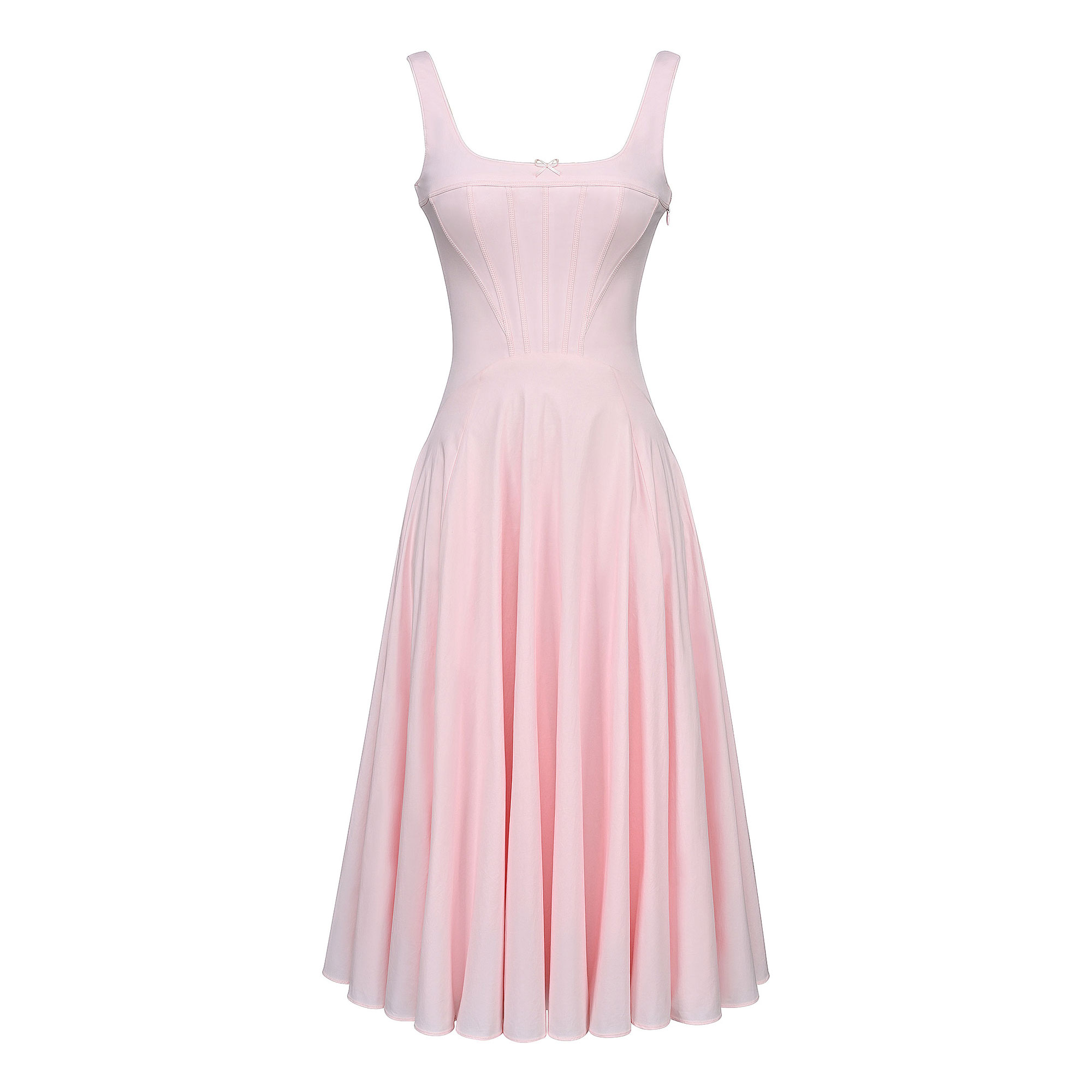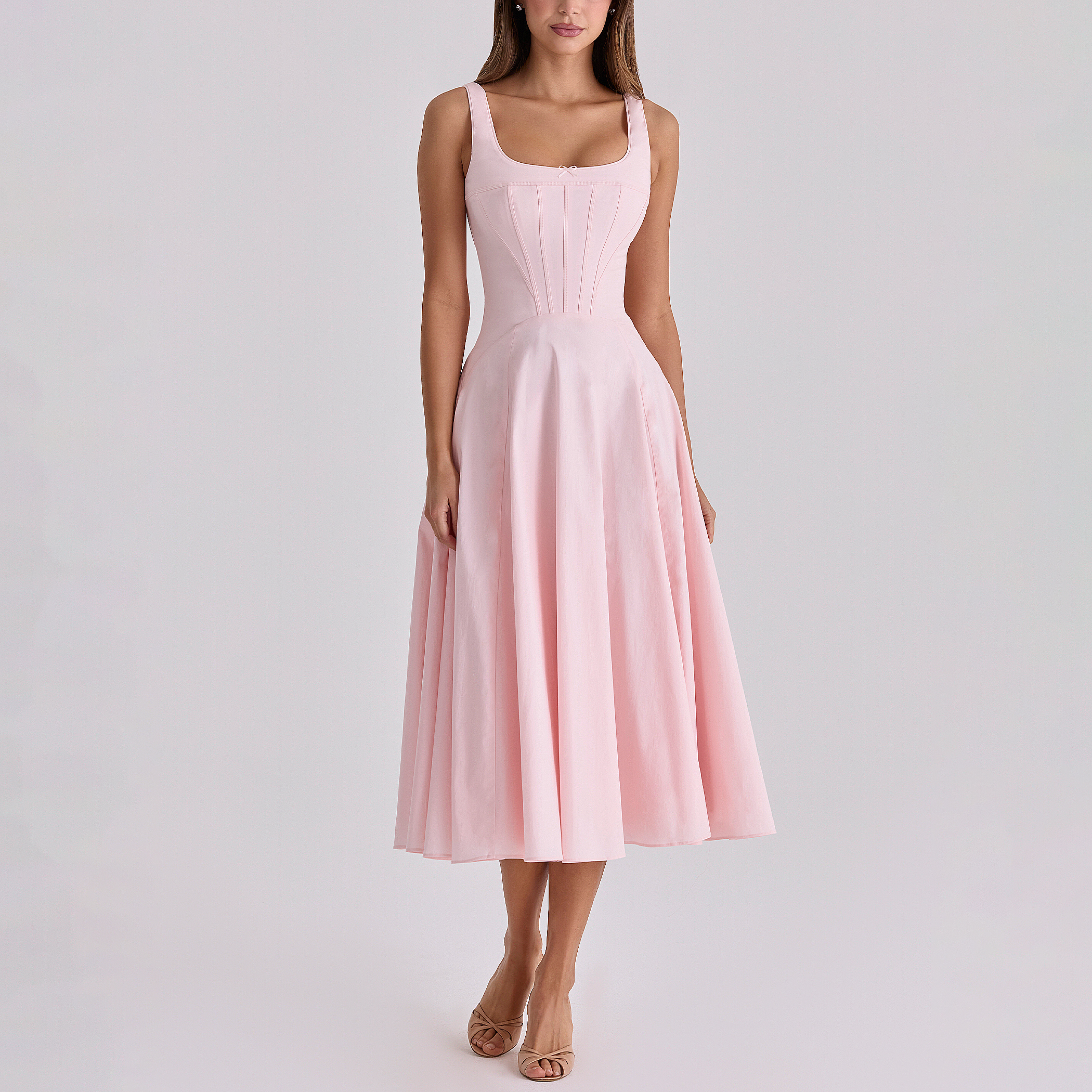 - Soft-square neckline, sleeveless design, fitted bodice with defined boning, lace-up back, flared pleated skirt, straight hem, midi length, luxurious stretch fabric, lined, hourglass silhouette