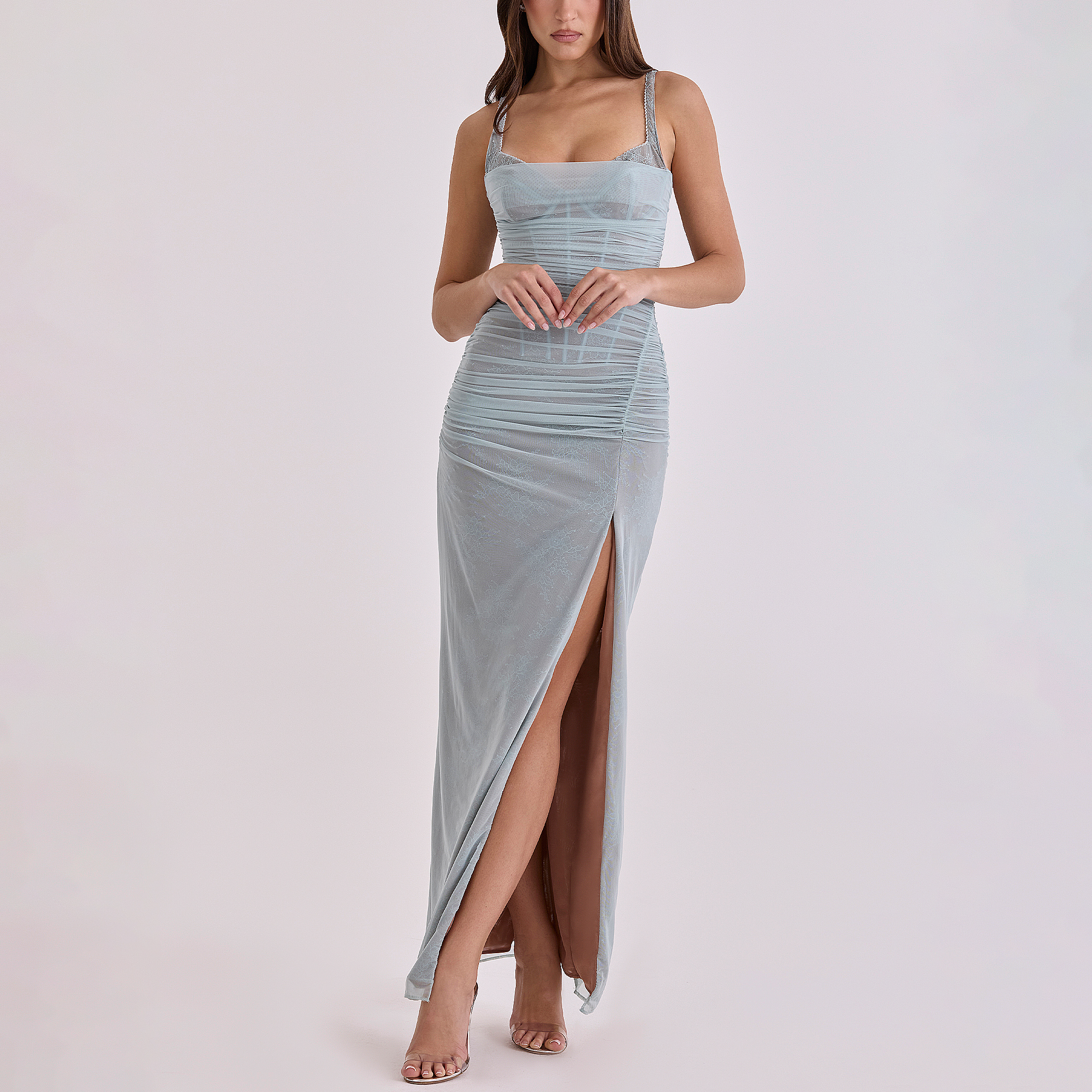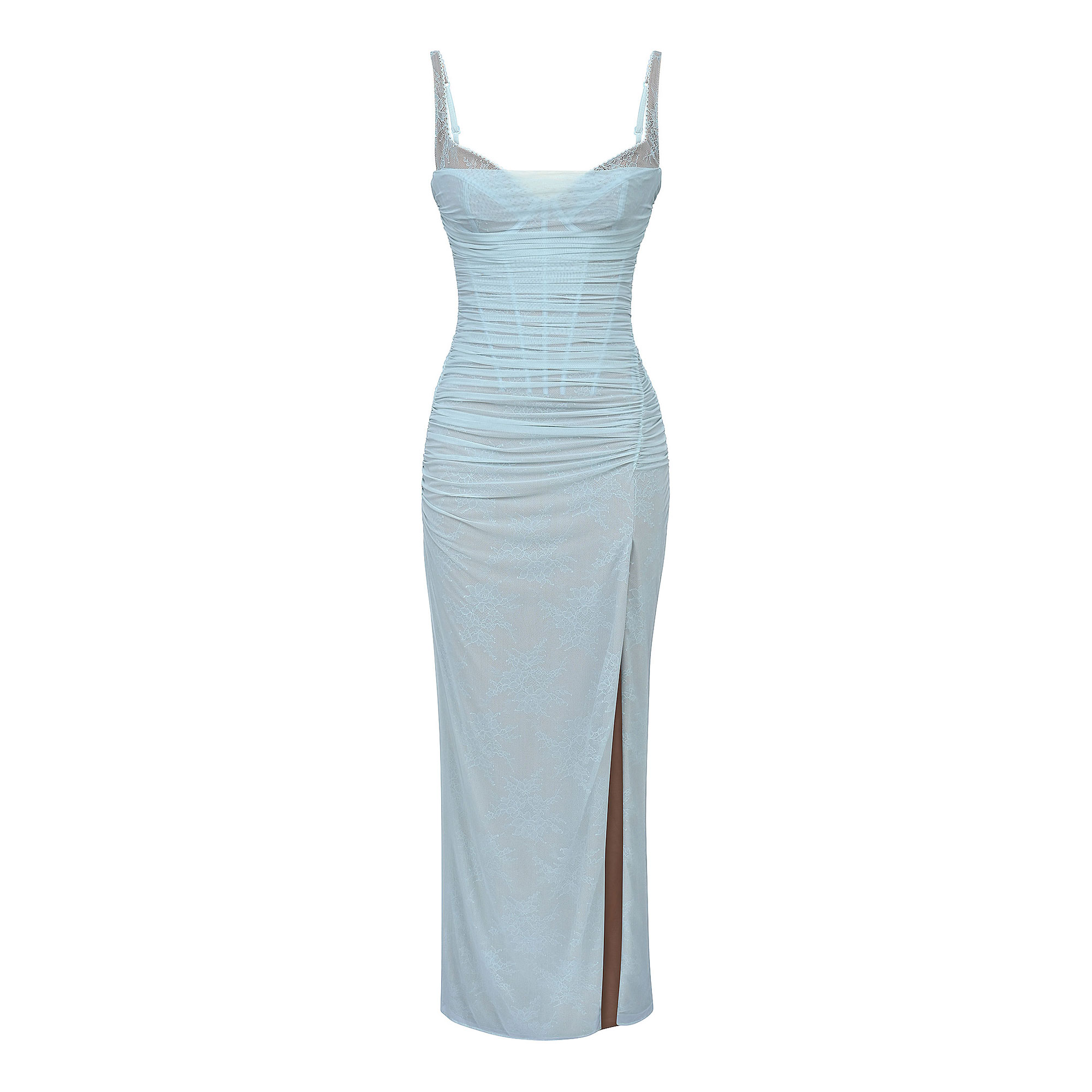 - Floral lace base with soft mesh overlay, power mesh lining with sculpting technology, delicate ruching and gathering, adjustable straps, zip closure, dramatic side split, maxi length