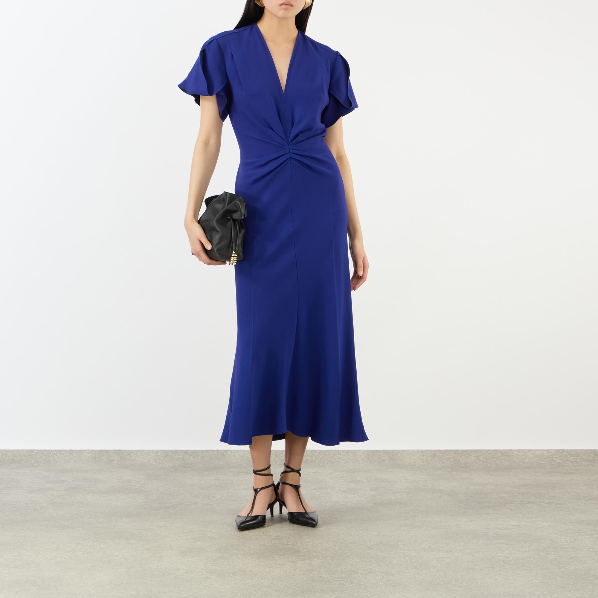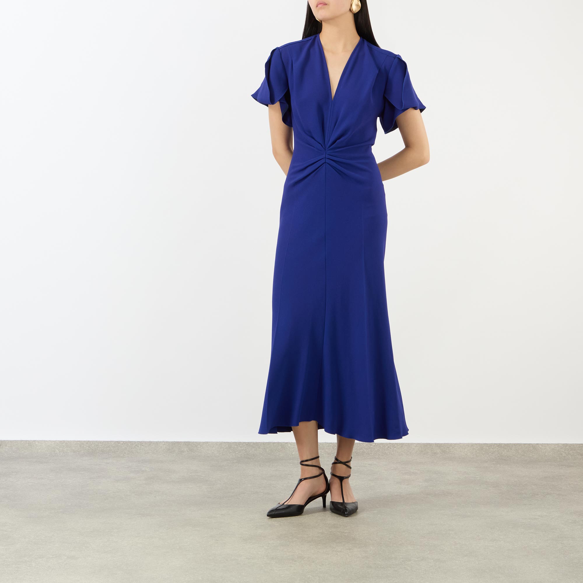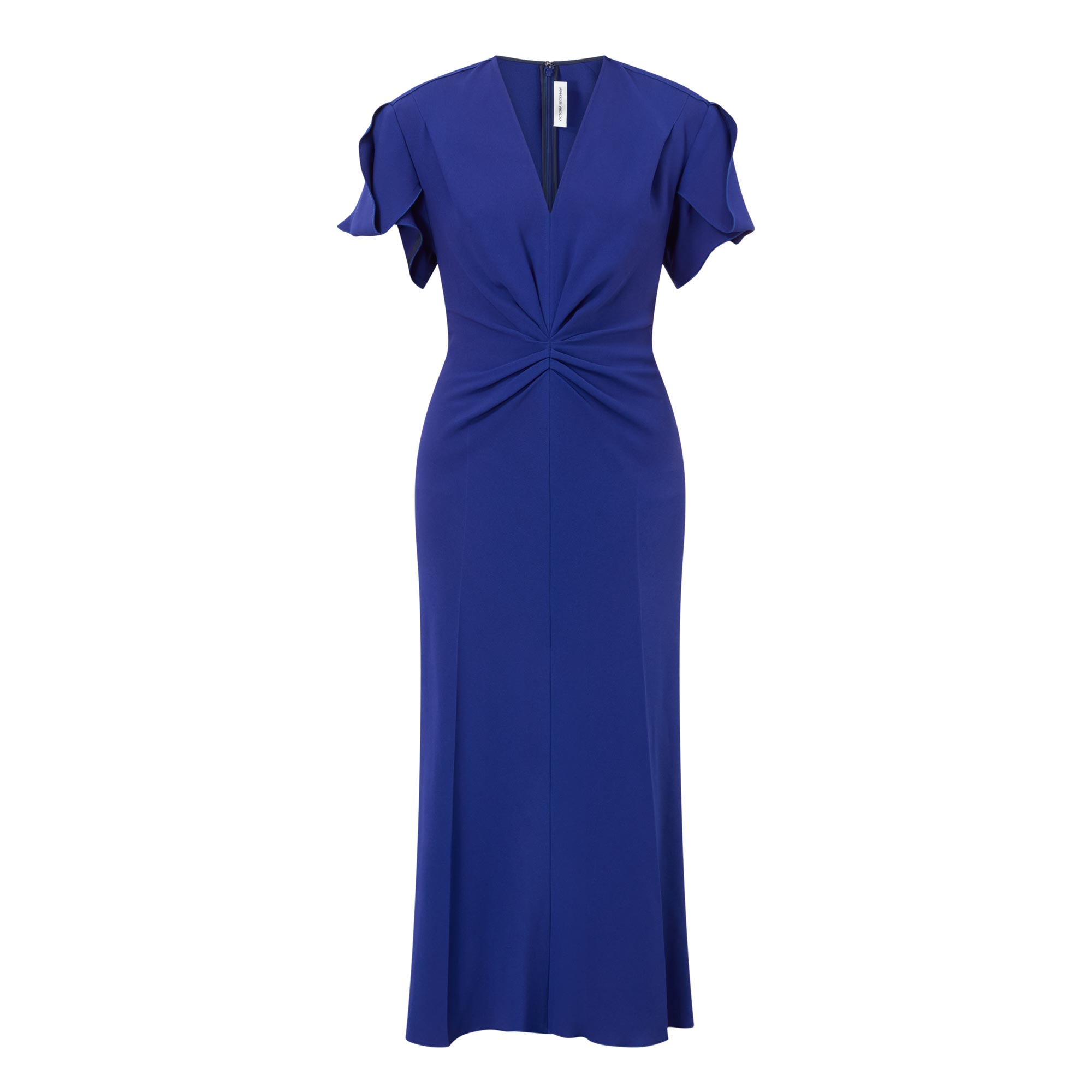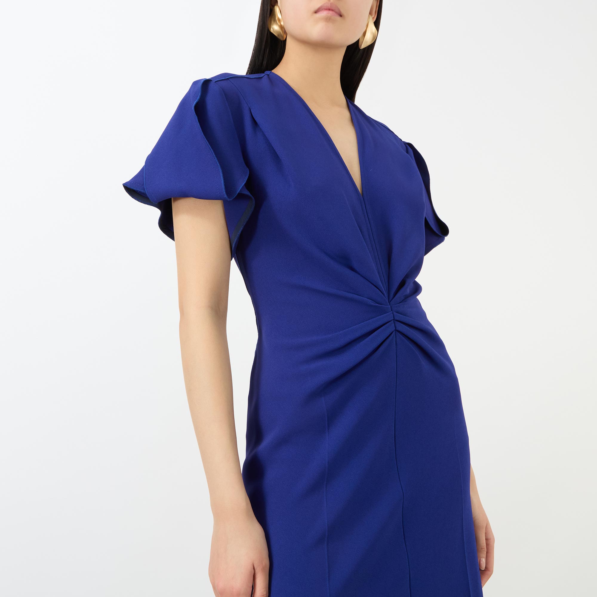 - V-neckline, short flutter sleeves, gathered bodice, rear concealed zip fastening, fitted through the waist and hips, flared asymmetric hem, midi length, smooth finish
