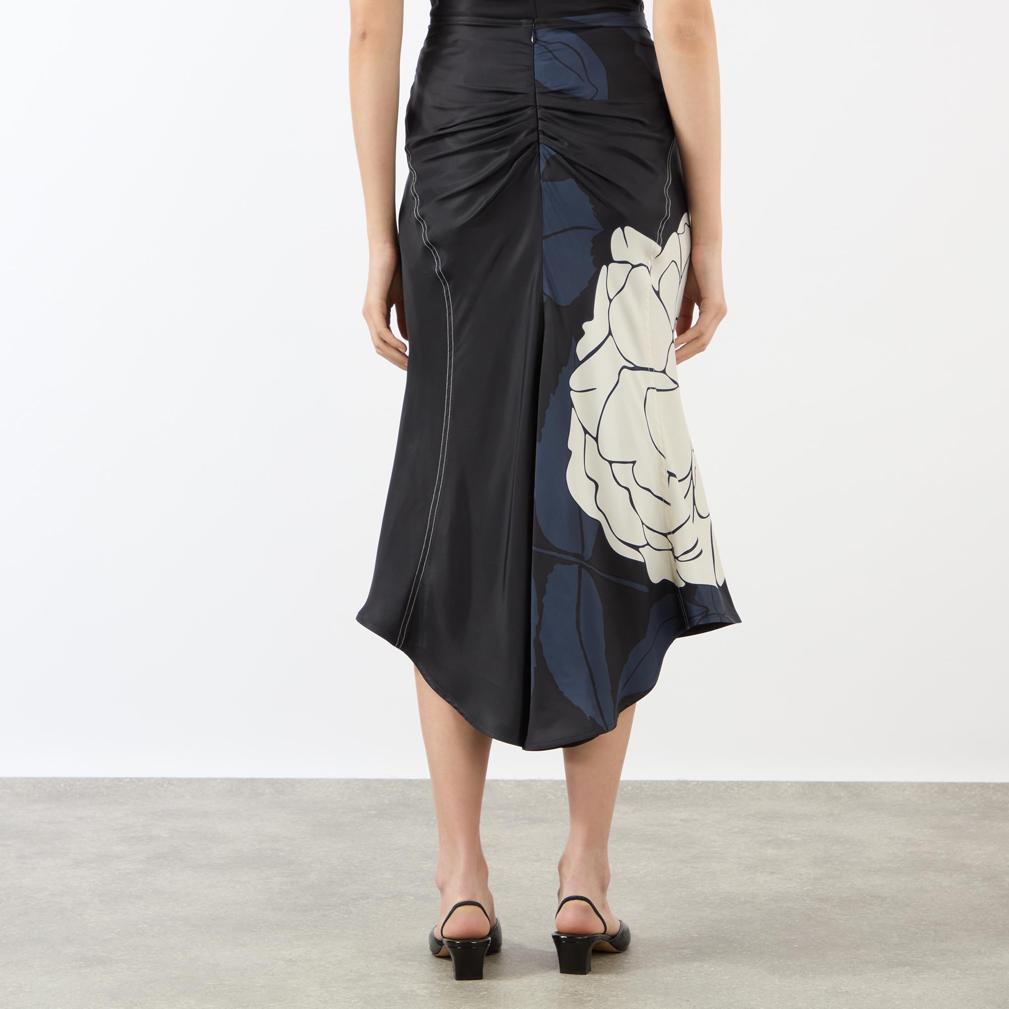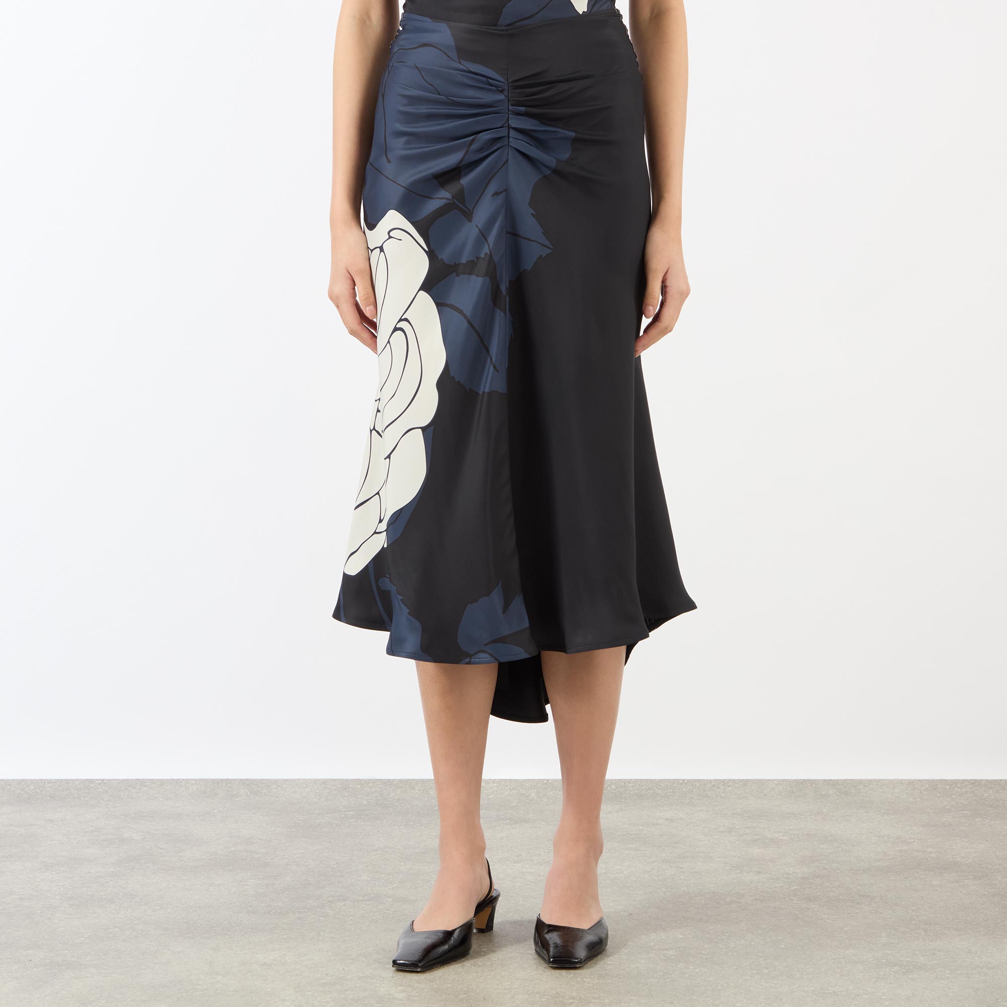 - High rise, gathered details on the back and front, concealed zip fastening, asymmetrical hemline, enlarged floral print throughout, midi length