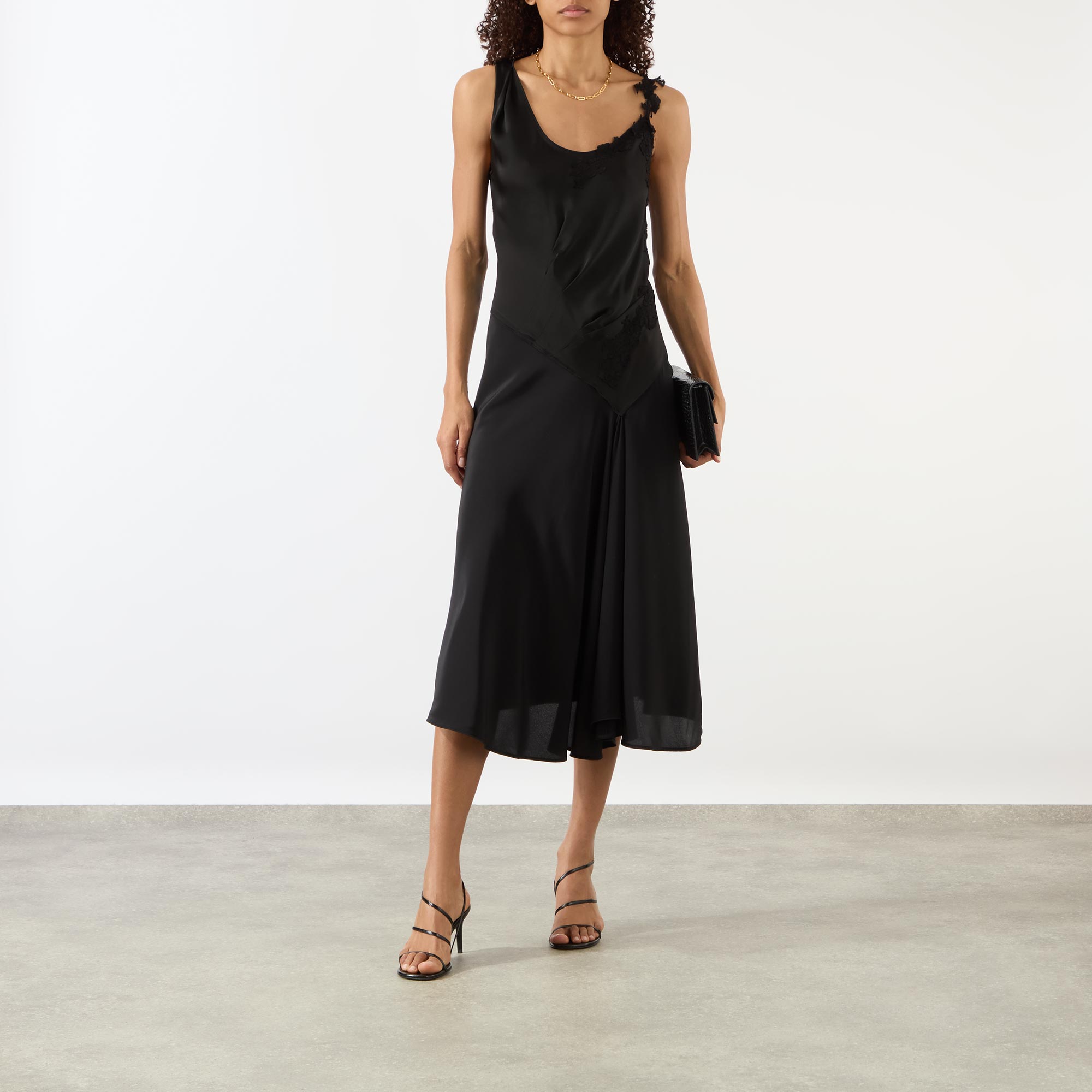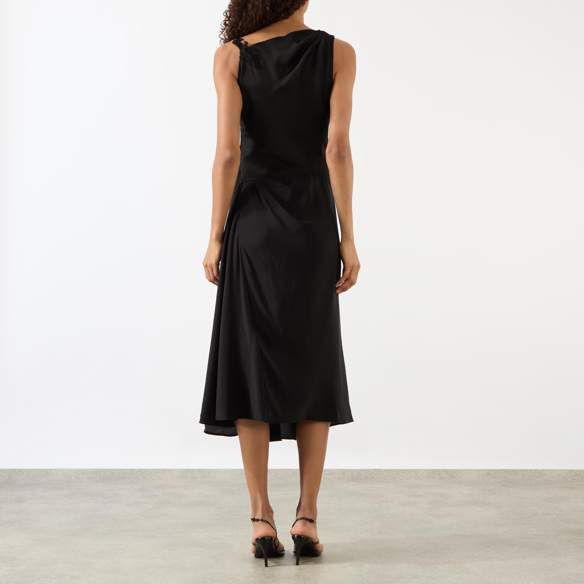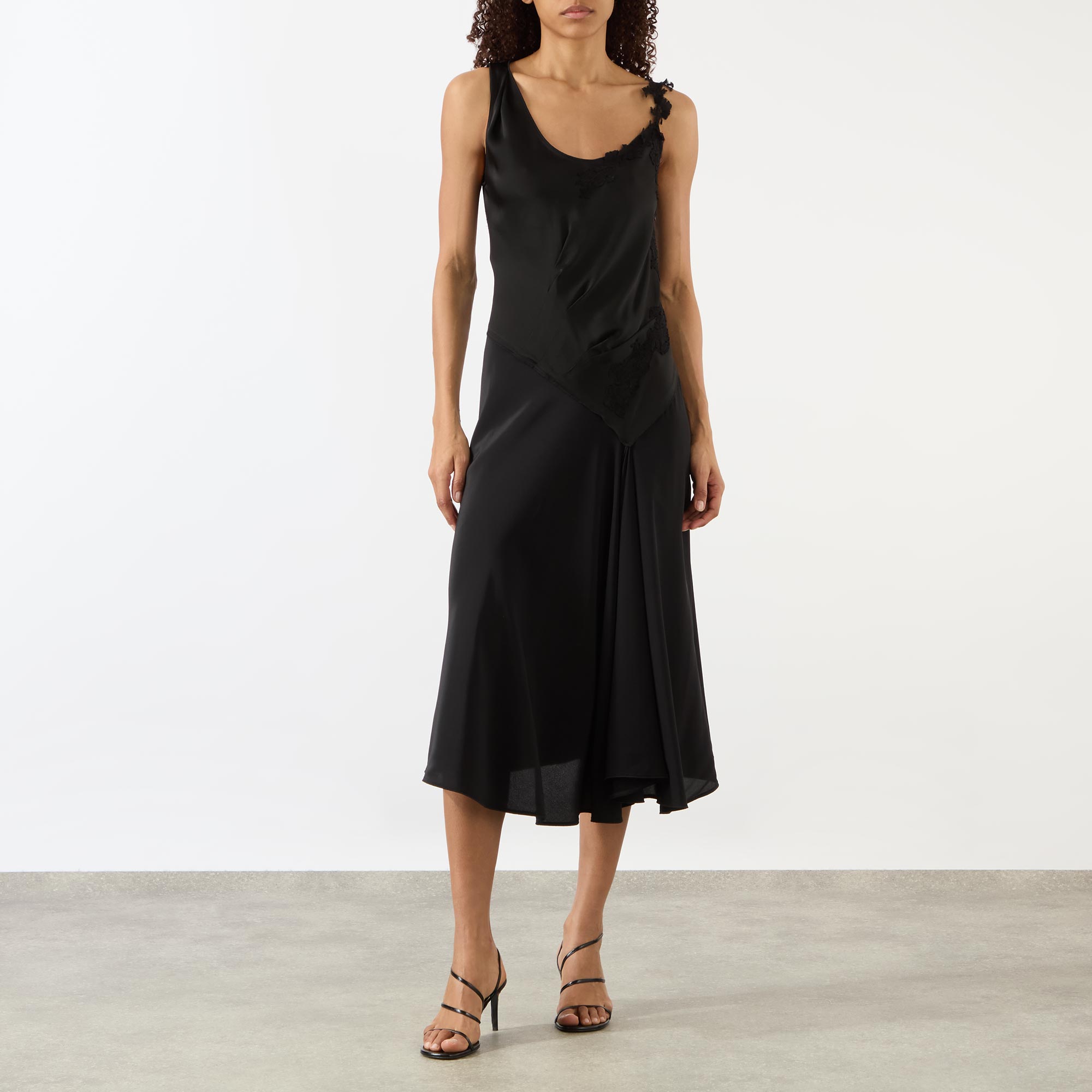 Deconstructed details and asymmetric silhouettes appear across the SS26 collection from Victoria Beckham, both of which can be seen in the design of this dress. The sleeveless design features a draped neckline and tonal lace detailing from one of the straps down through the bodice, while securing with a side zip fastening, before falling to a flared, midi length.