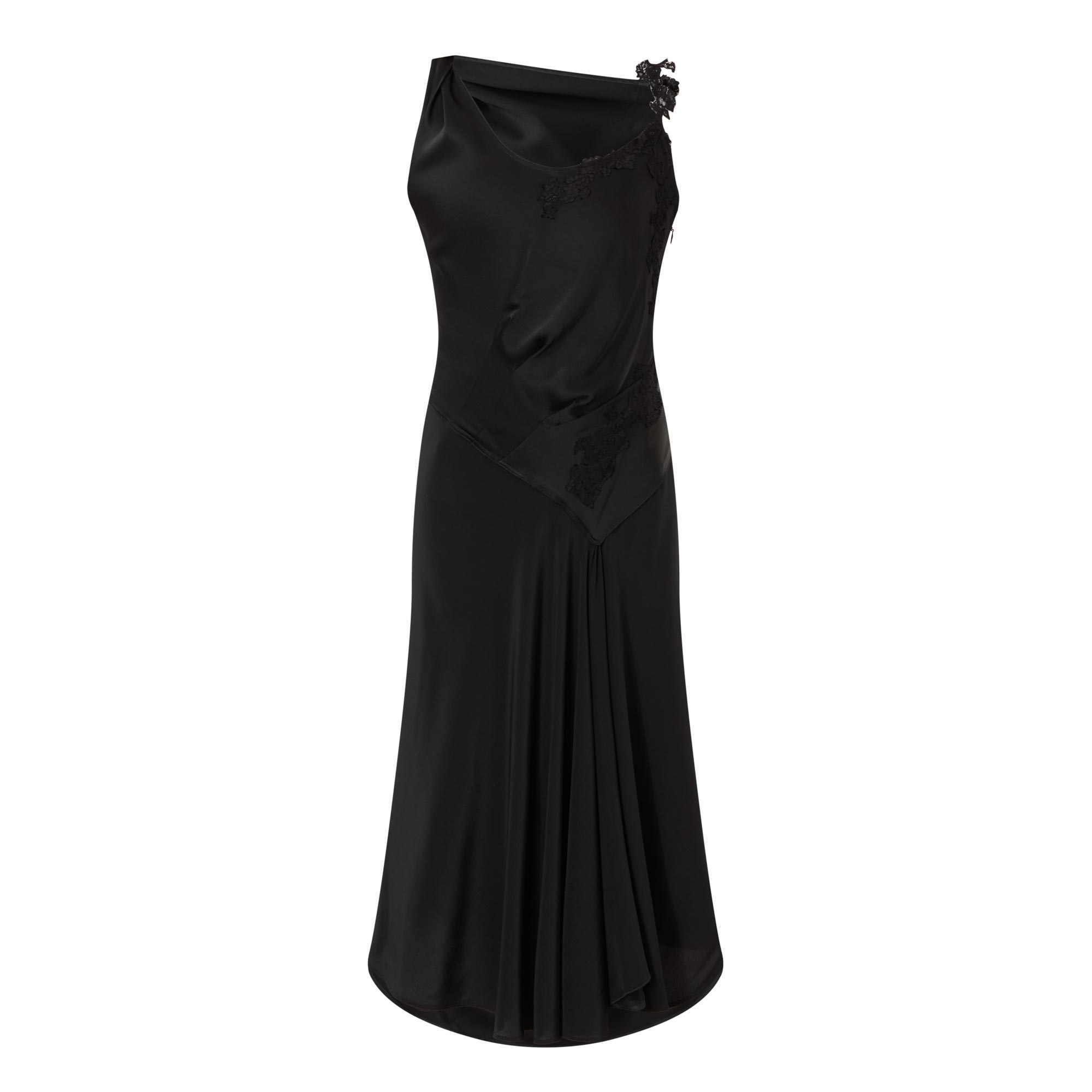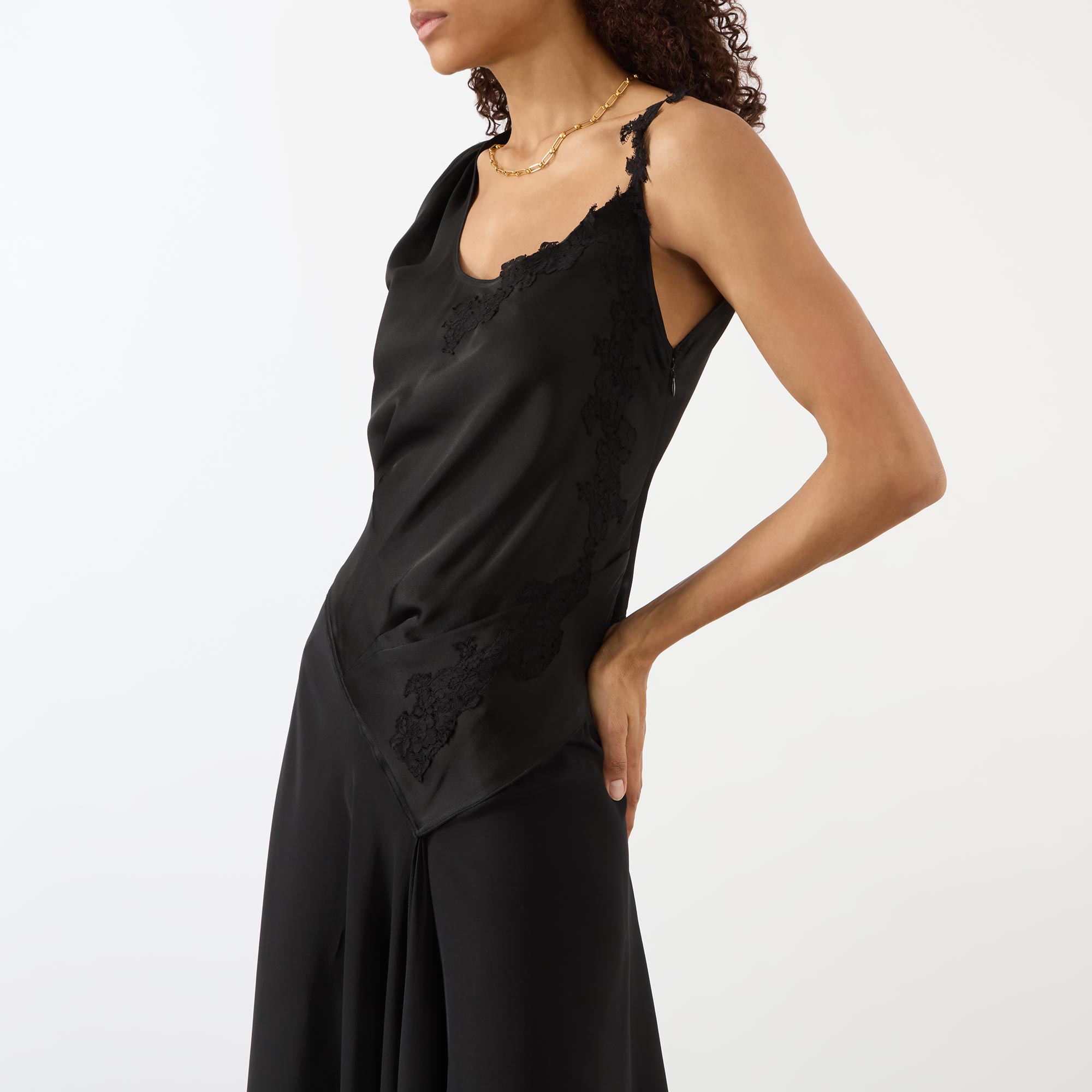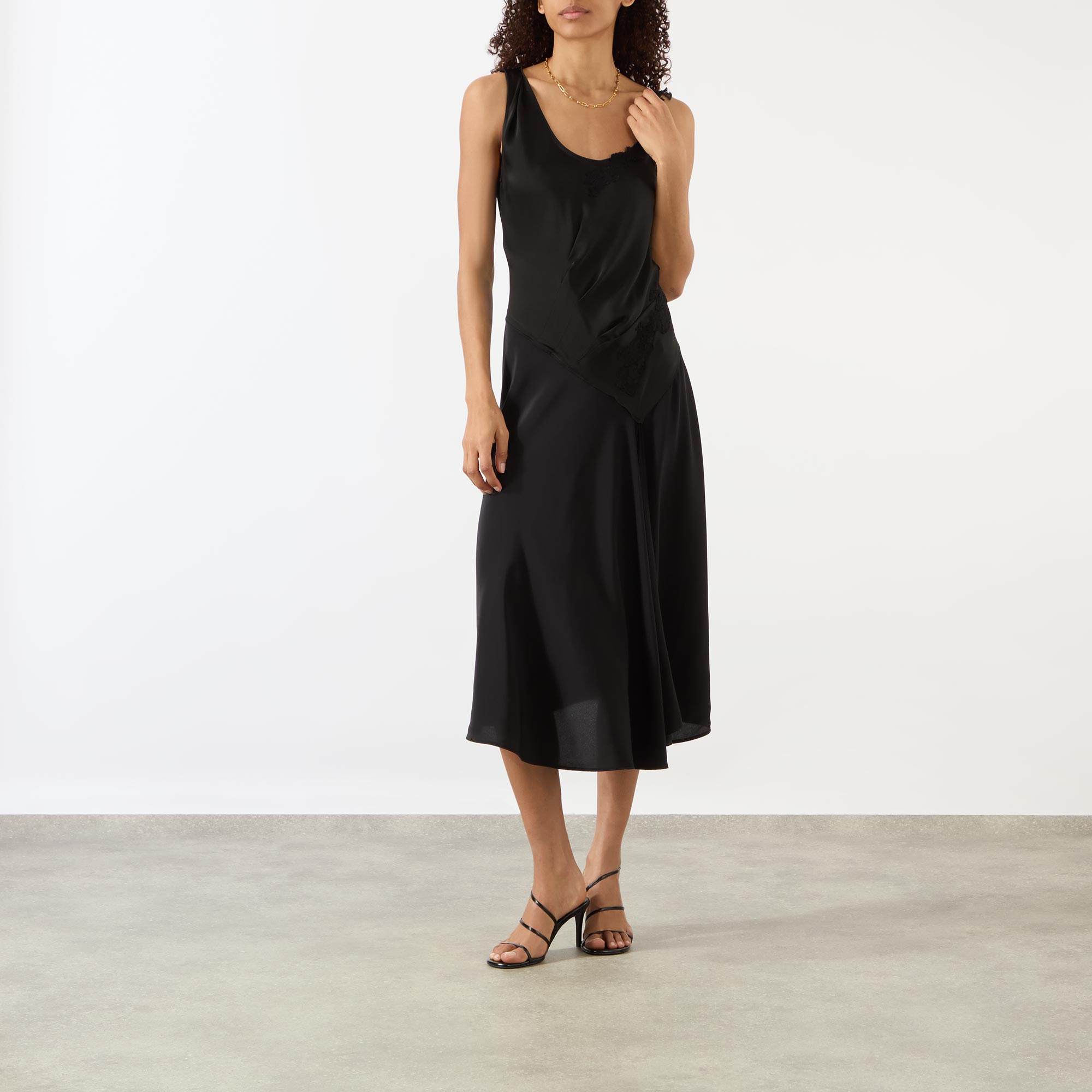 Deconstructed details and asymmetric silhouettes appear across the SS26 collection from Victoria Beckham, both of which can be seen in the design of this dress. The sleeveless design features a draped neckline and tonal lace detailing from one of the straps down through the bodice, while securing with a side zip fastening, before falling to a flared, midi length.