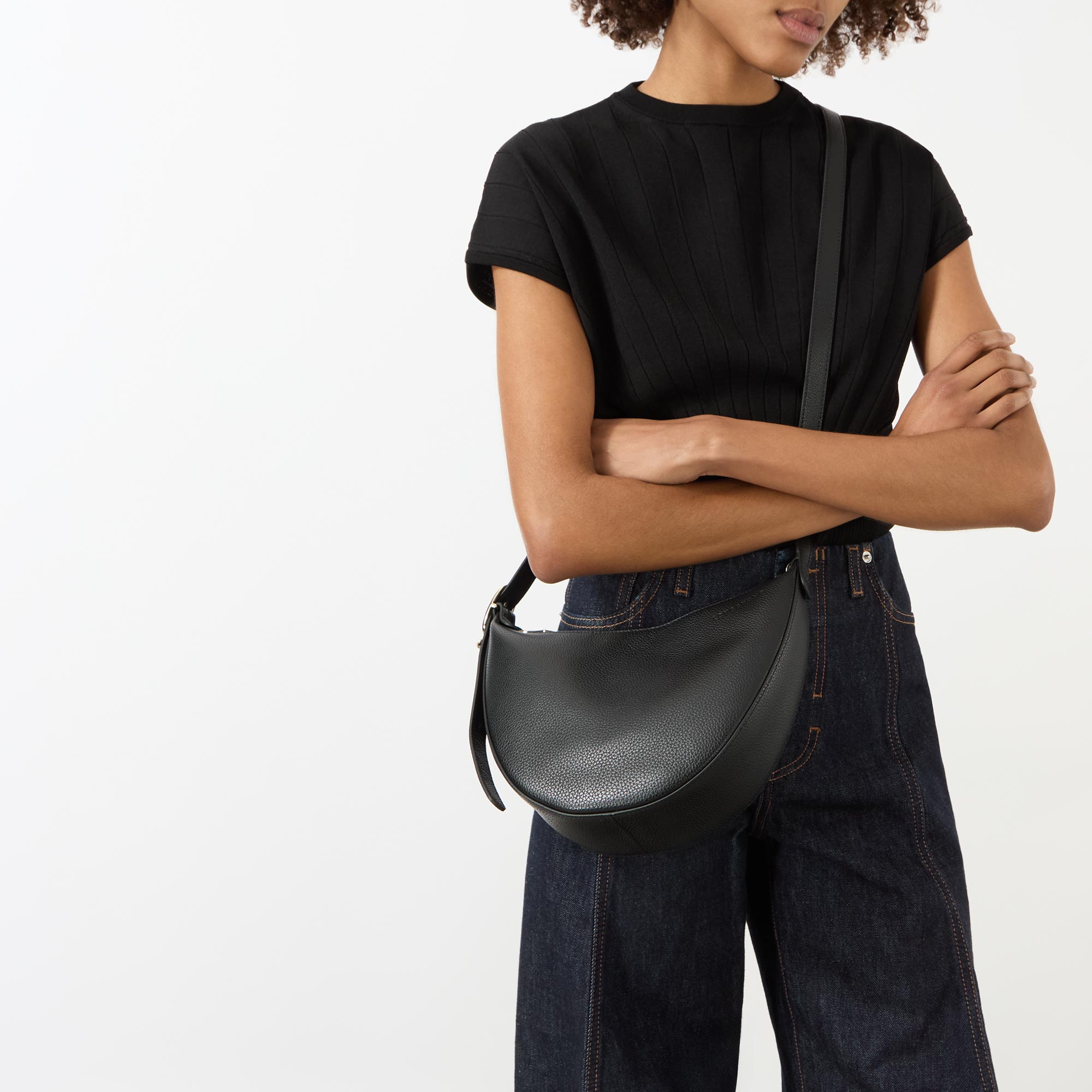 - Half moon shape, zip fastening, adjustable strap, logo detail