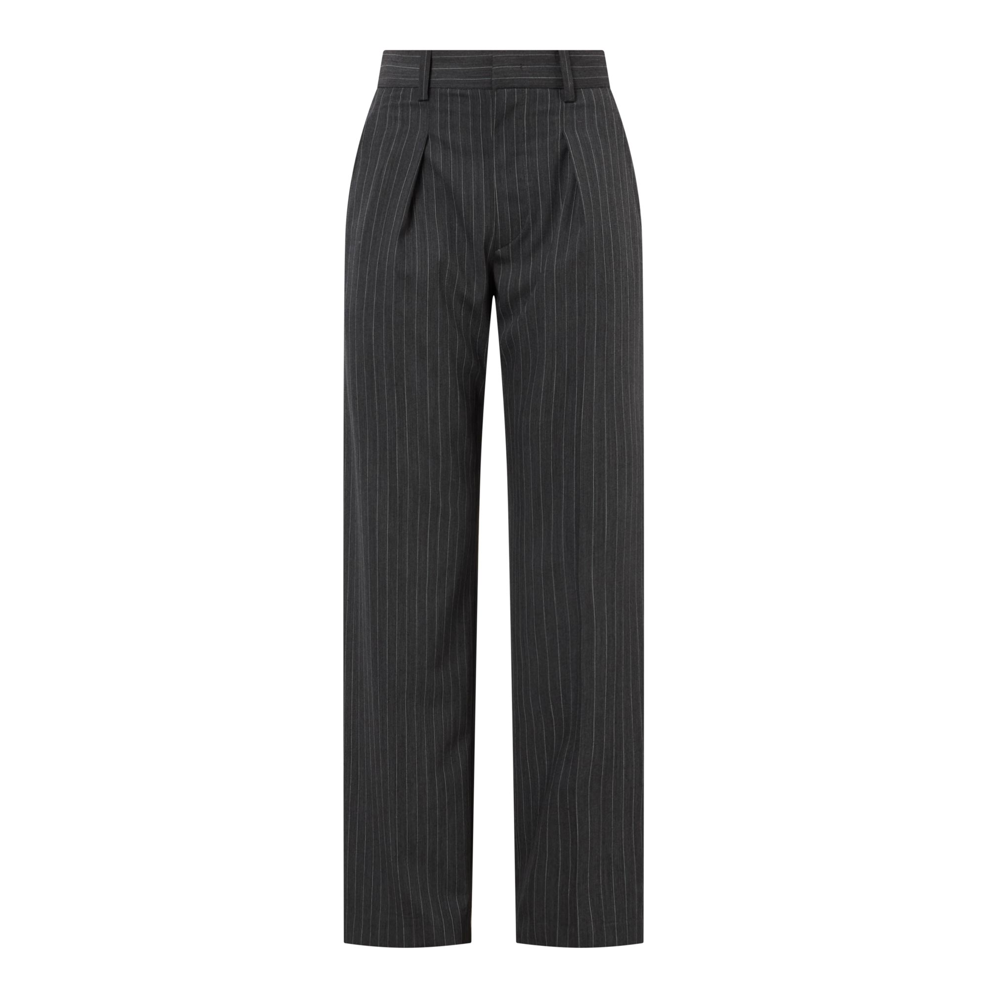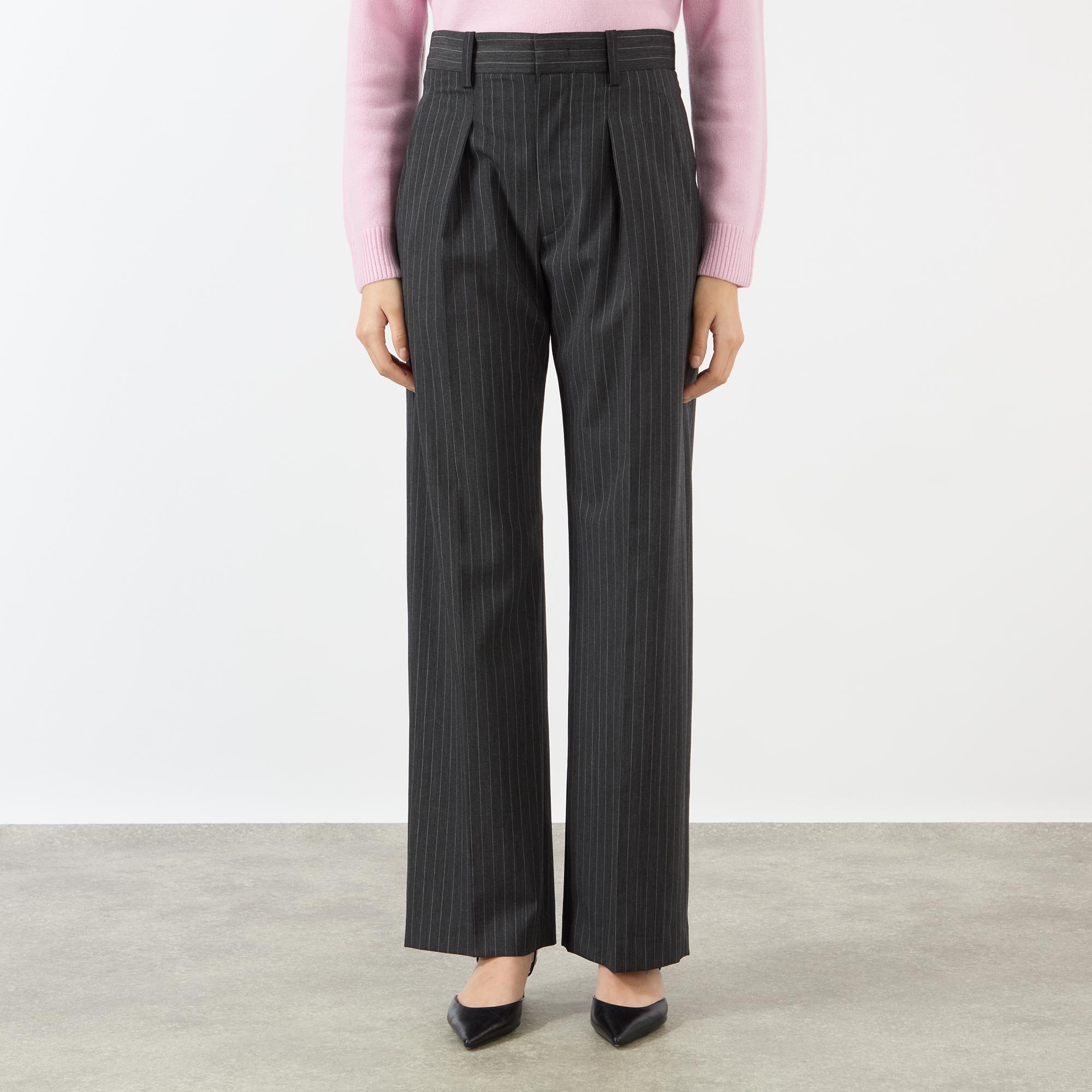 - Concealed zip-fly and hook-and-bar fastening, belt loops, two side in-seam pockets, two rear welt pockets with button fastenings, pinstripe pattern, high-rise, wide-cut leg, pressed creases, smooth fabric