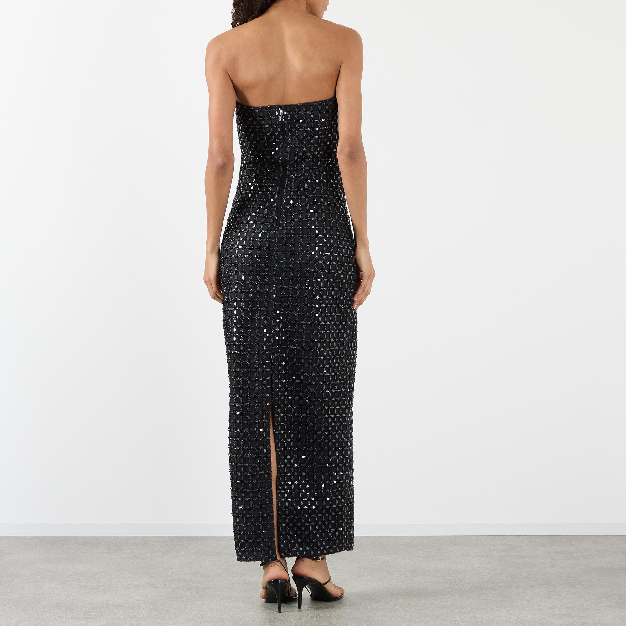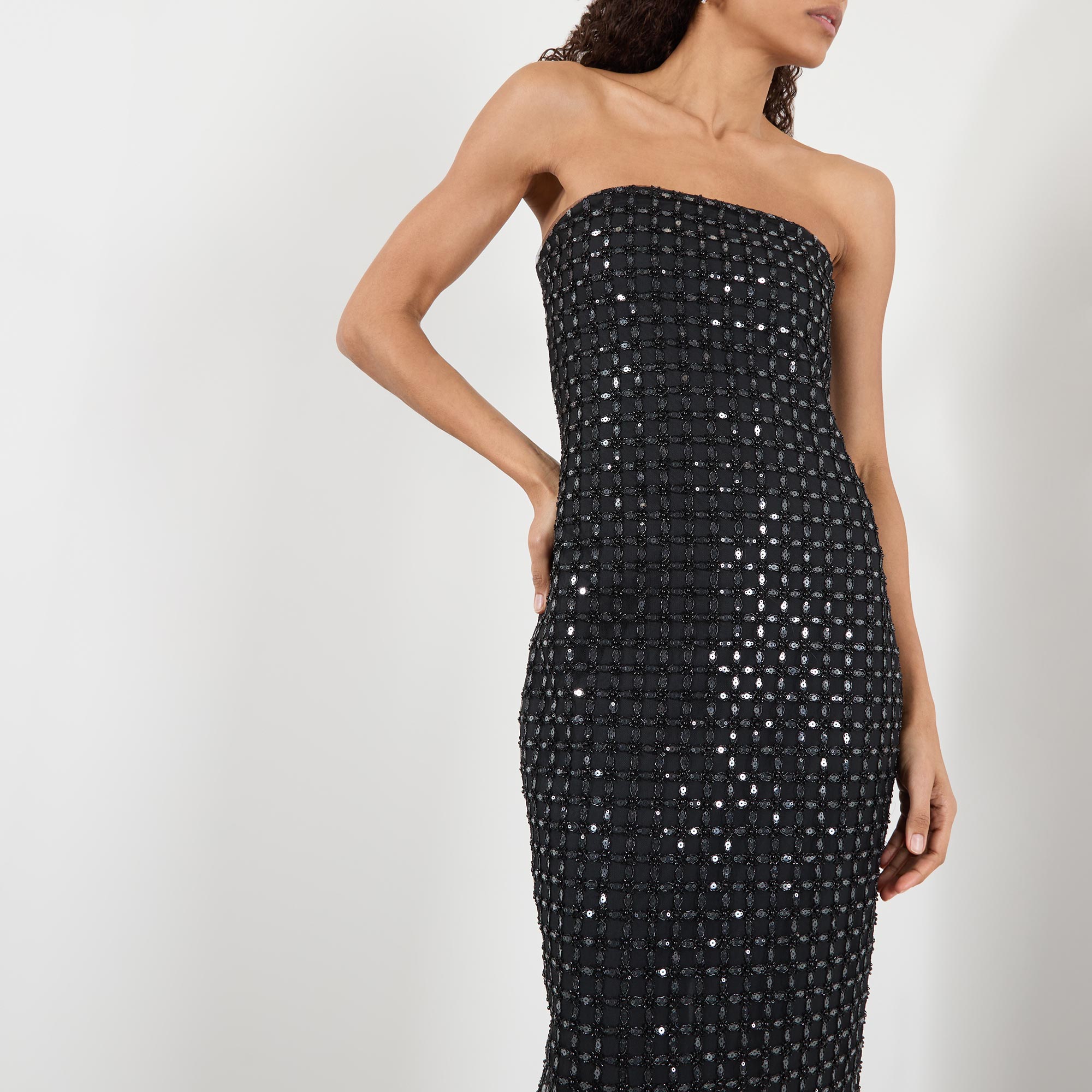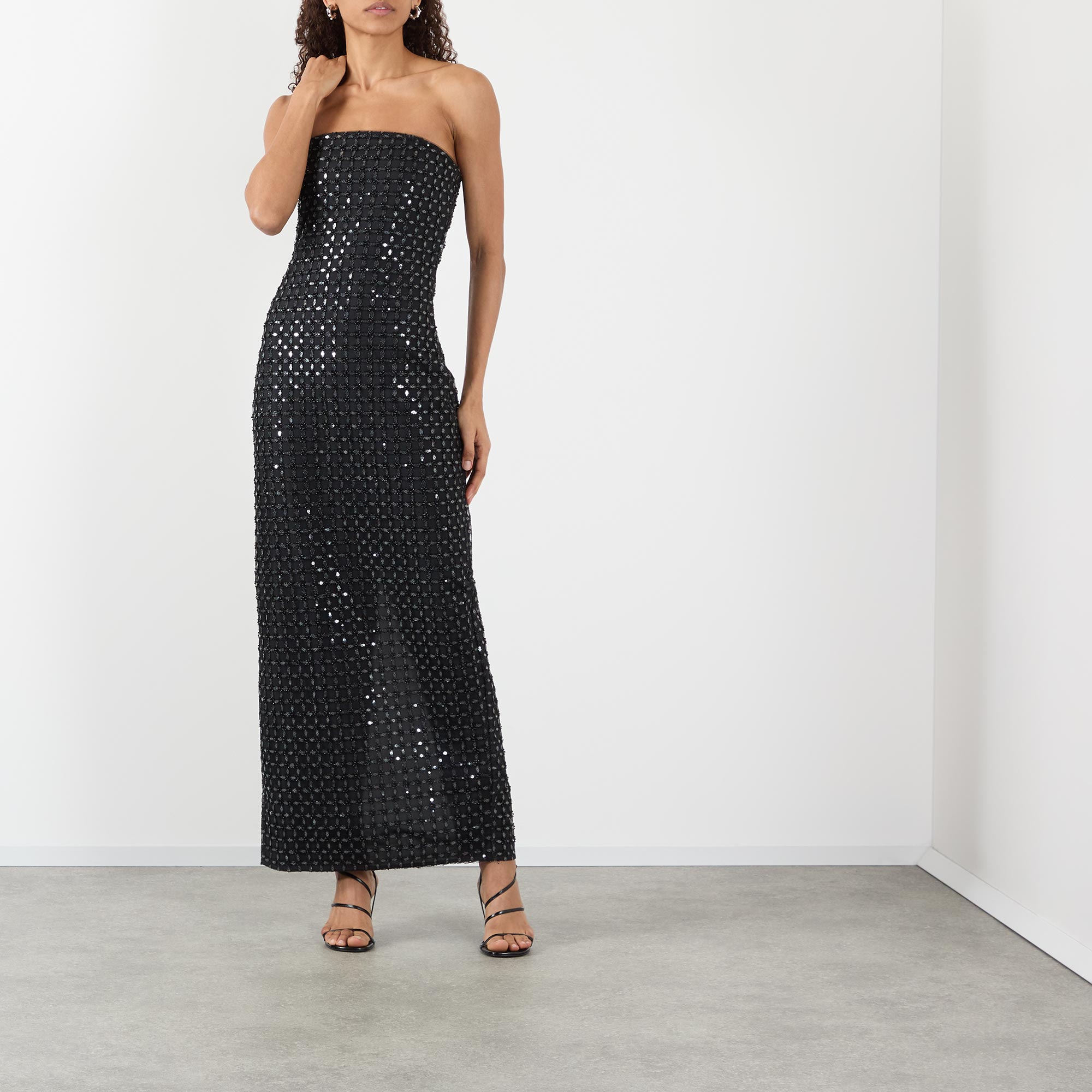 - Strapless, maxi length, tube-style silhouette, all-over beaded pattern, concealed zip fastening, slit to the back
