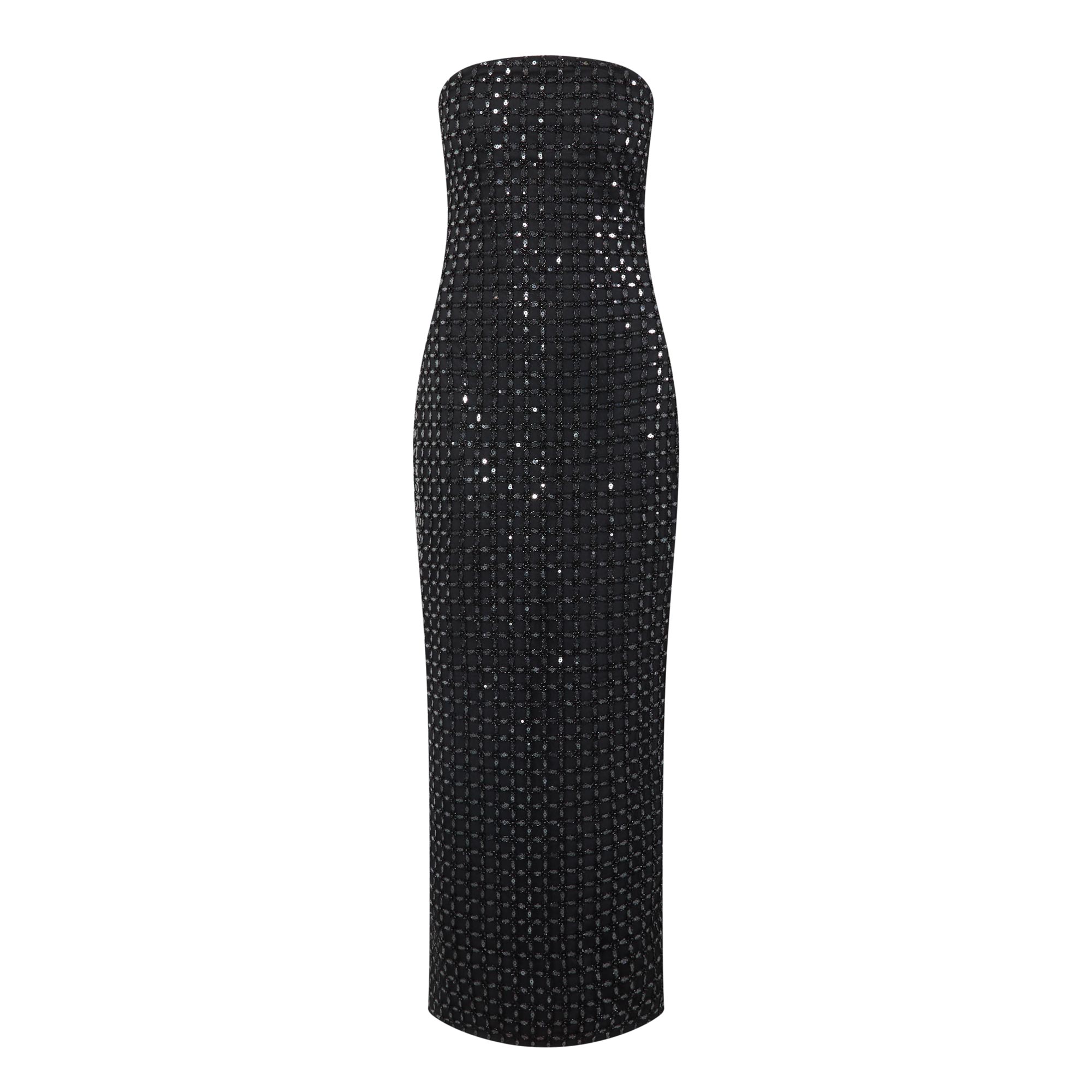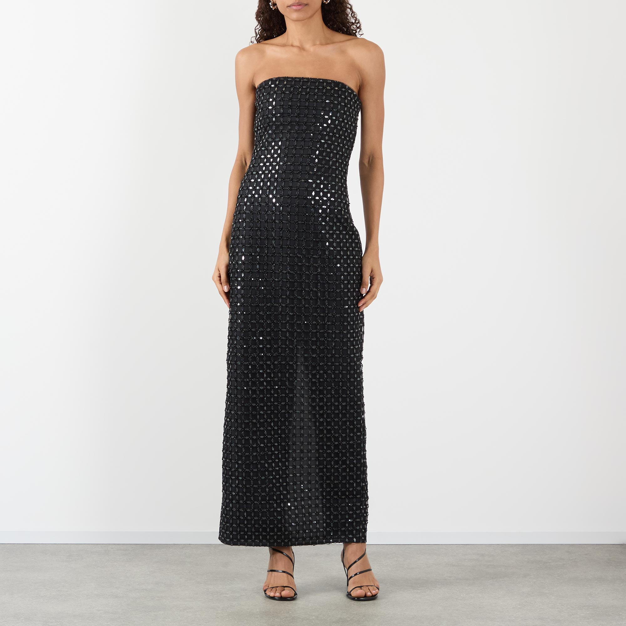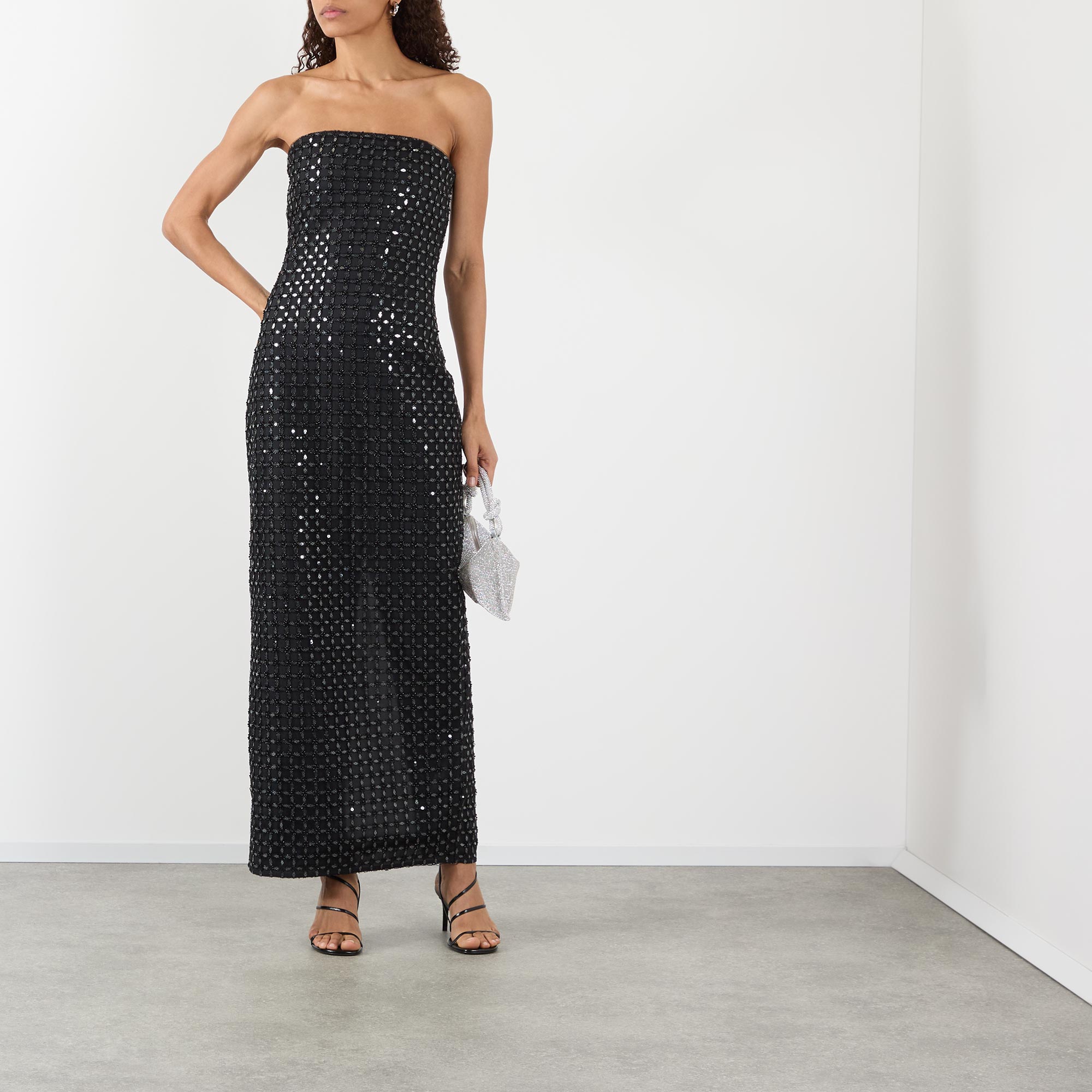 - Strapless, maxi length, tube-style silhouette, all-over beaded pattern, concealed zip fastening, slit to the back