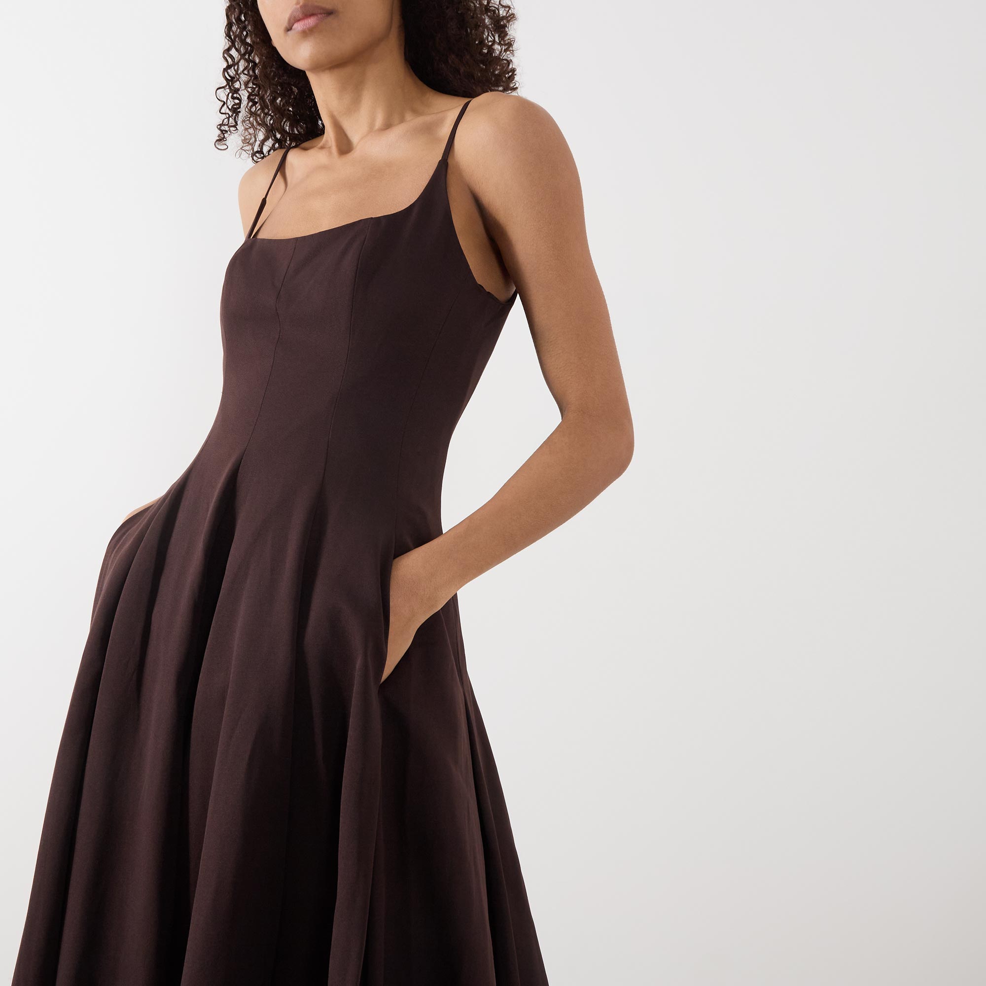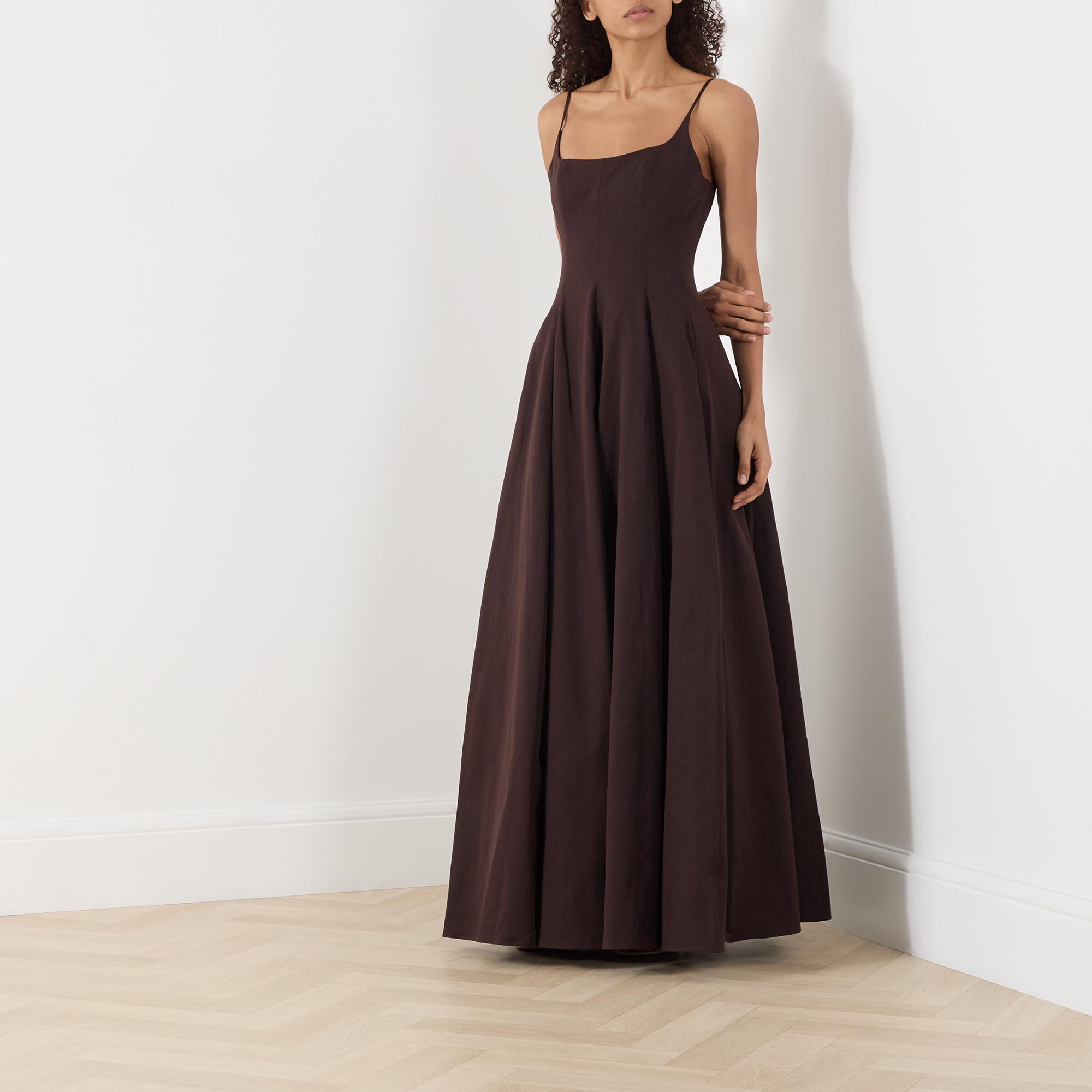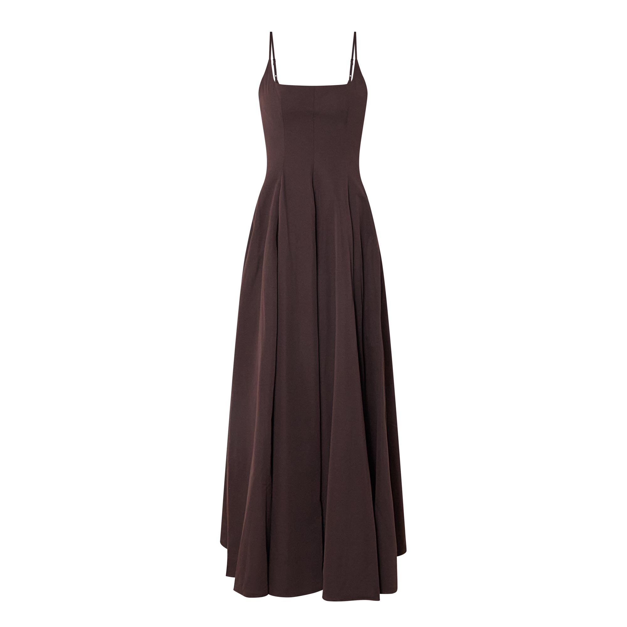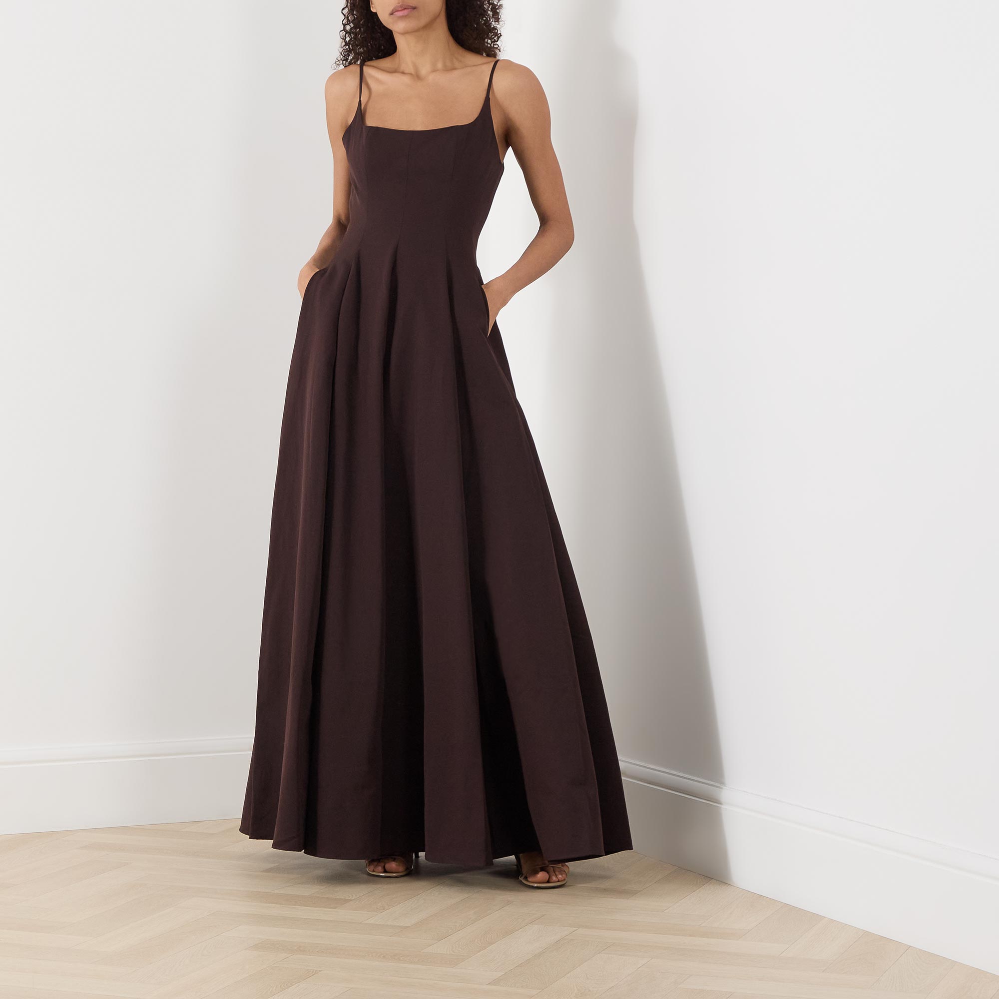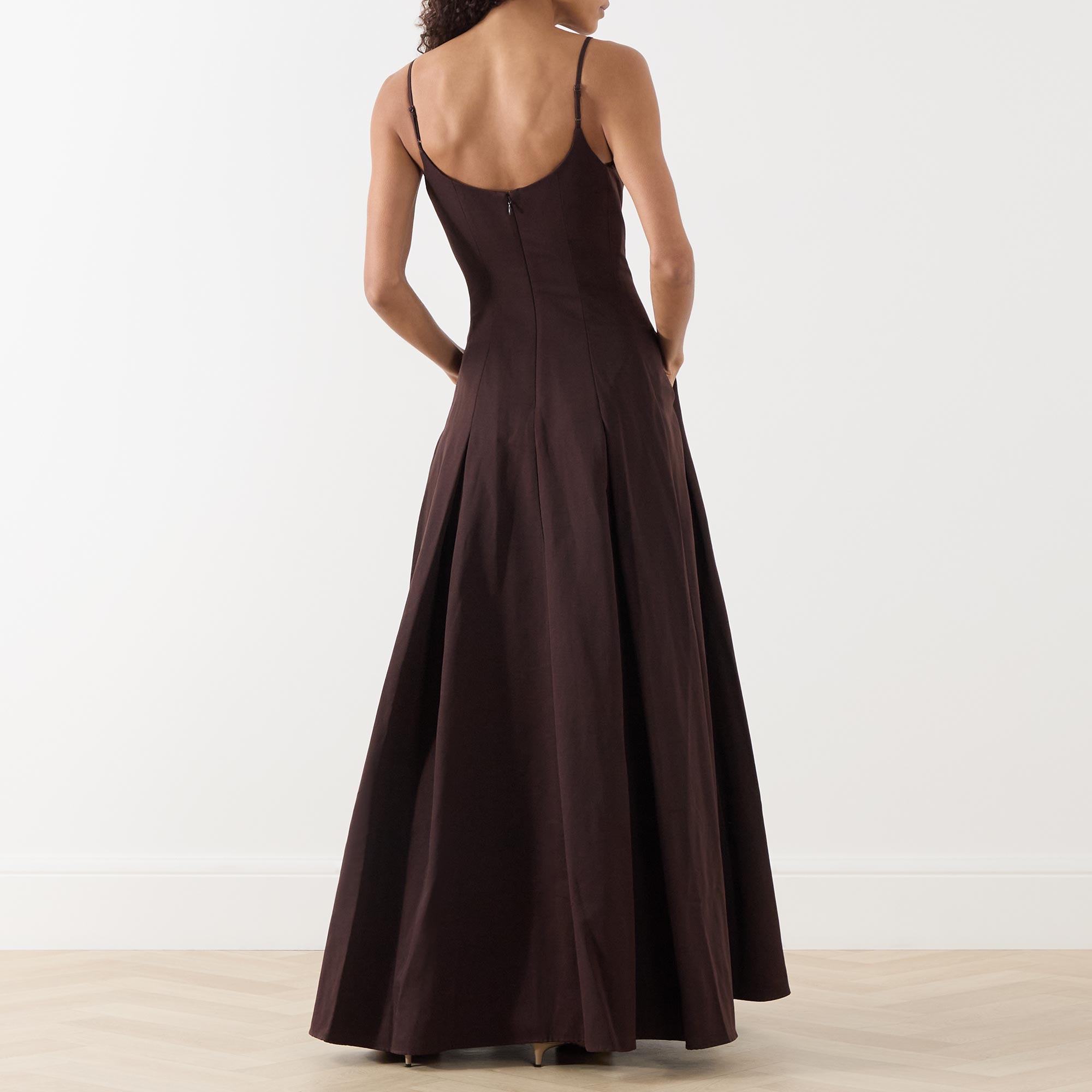 - Sleeveless, thin adjustable spaghetti straps, square-cut neckline, back zip-fastening closure, fitted bodice, two side in-seam pockets, flared silhouette, pleated skirt, maxi length