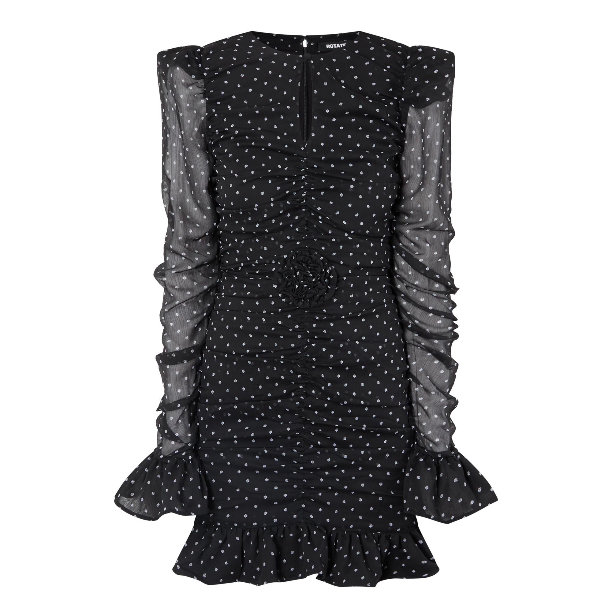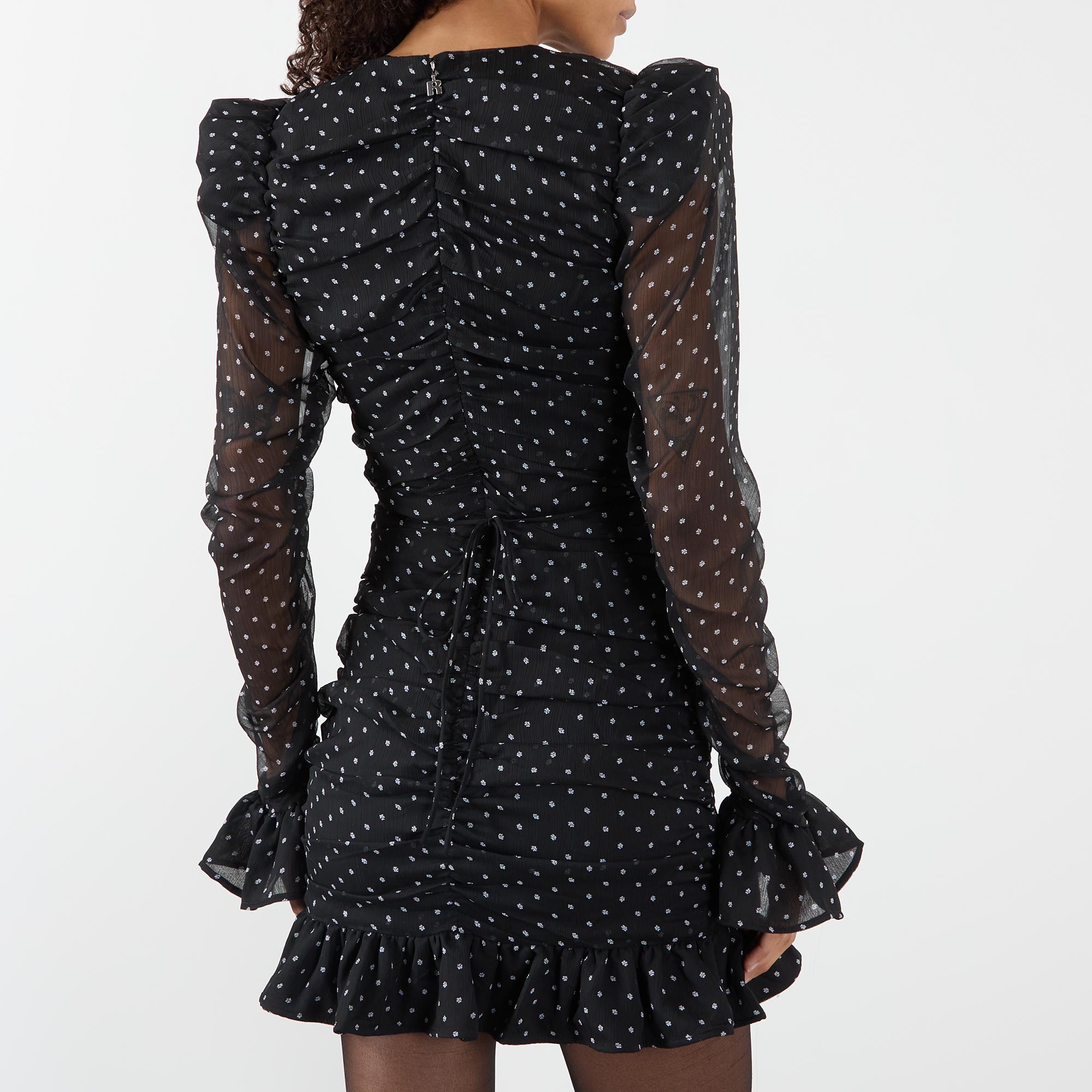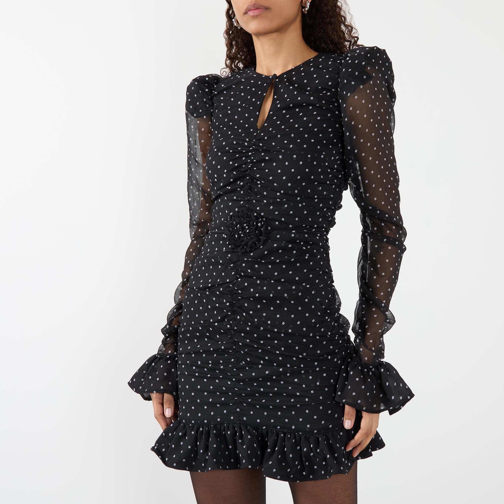 - Long sleeves, round neckline, front keyhole detail, back zip-fastening closure, gathered design, polka dot pattern, fluted cuffs, ruffle hemline, mini length