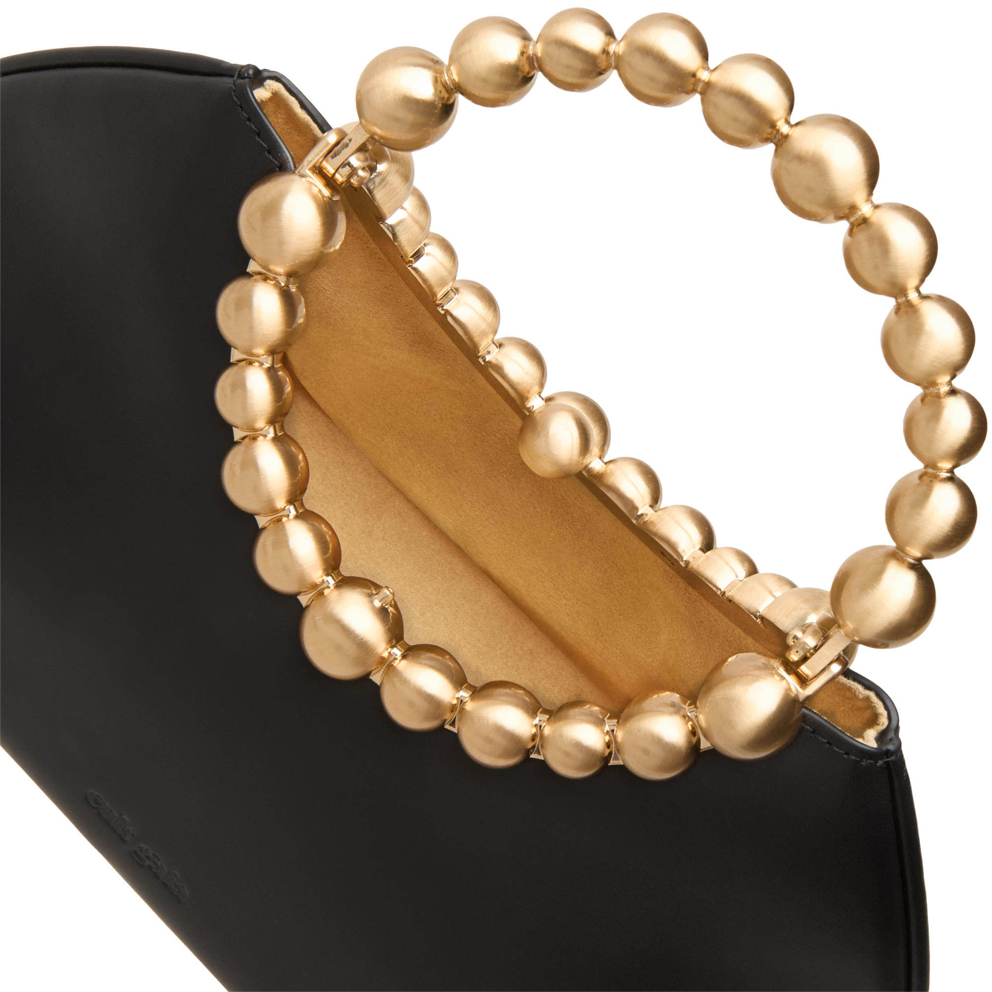 • Top carry handle, clasp closure, gold-tone beaded details, smooth leather finish, debossed logo details