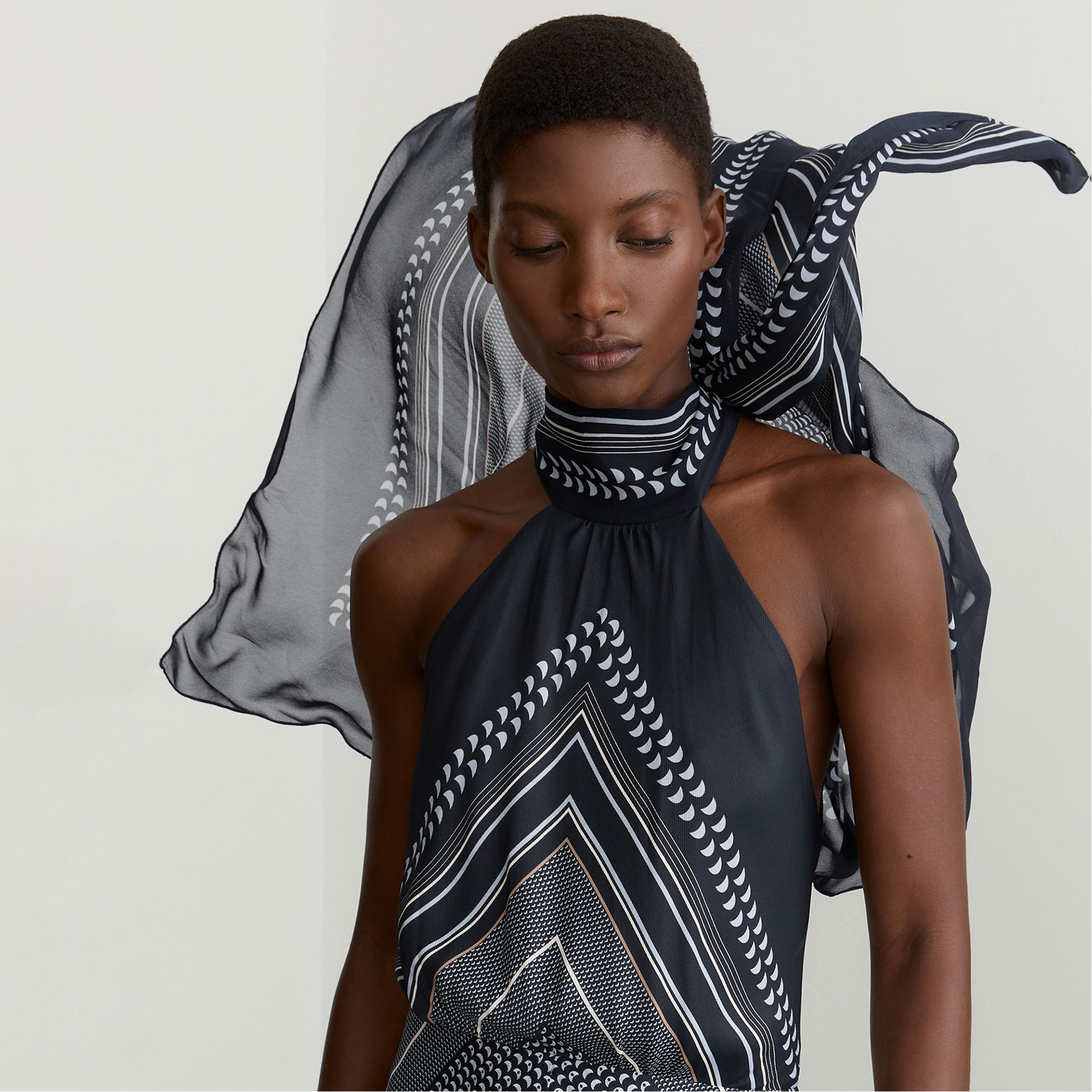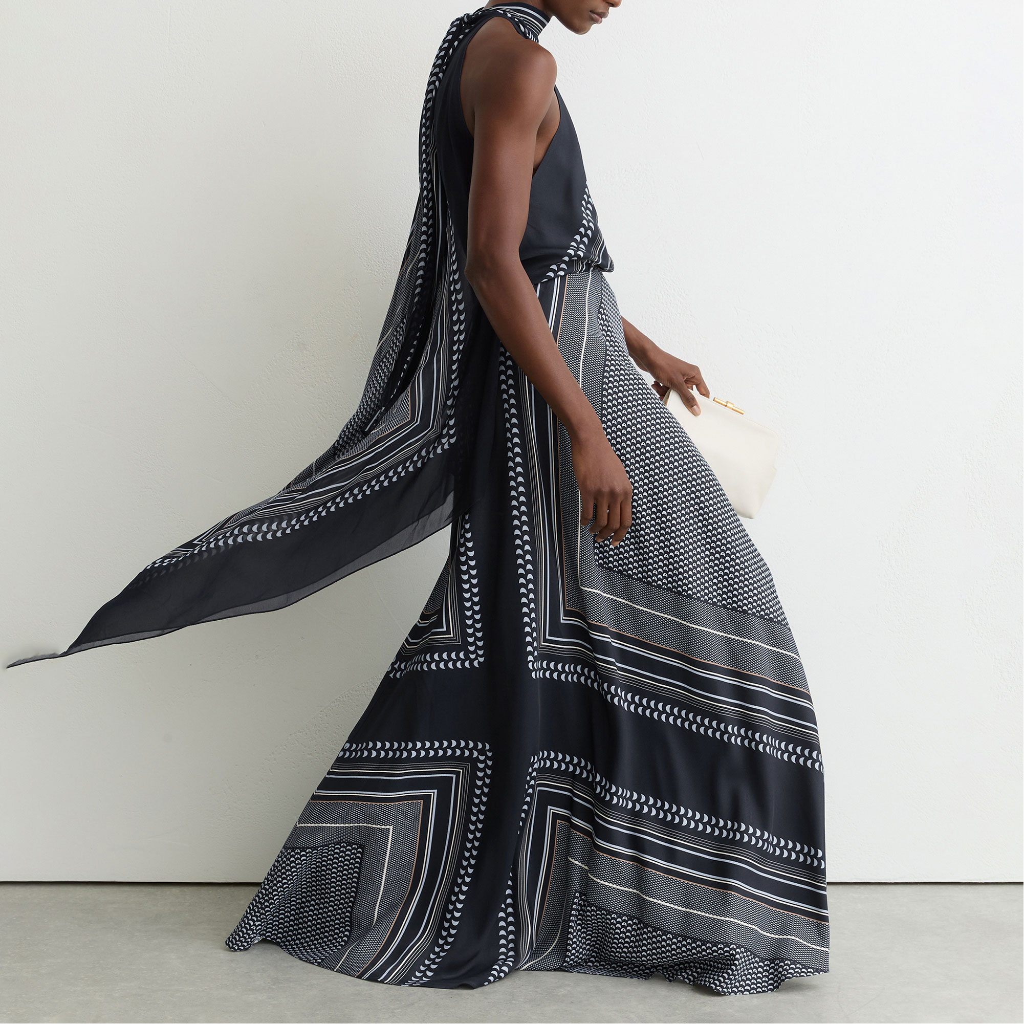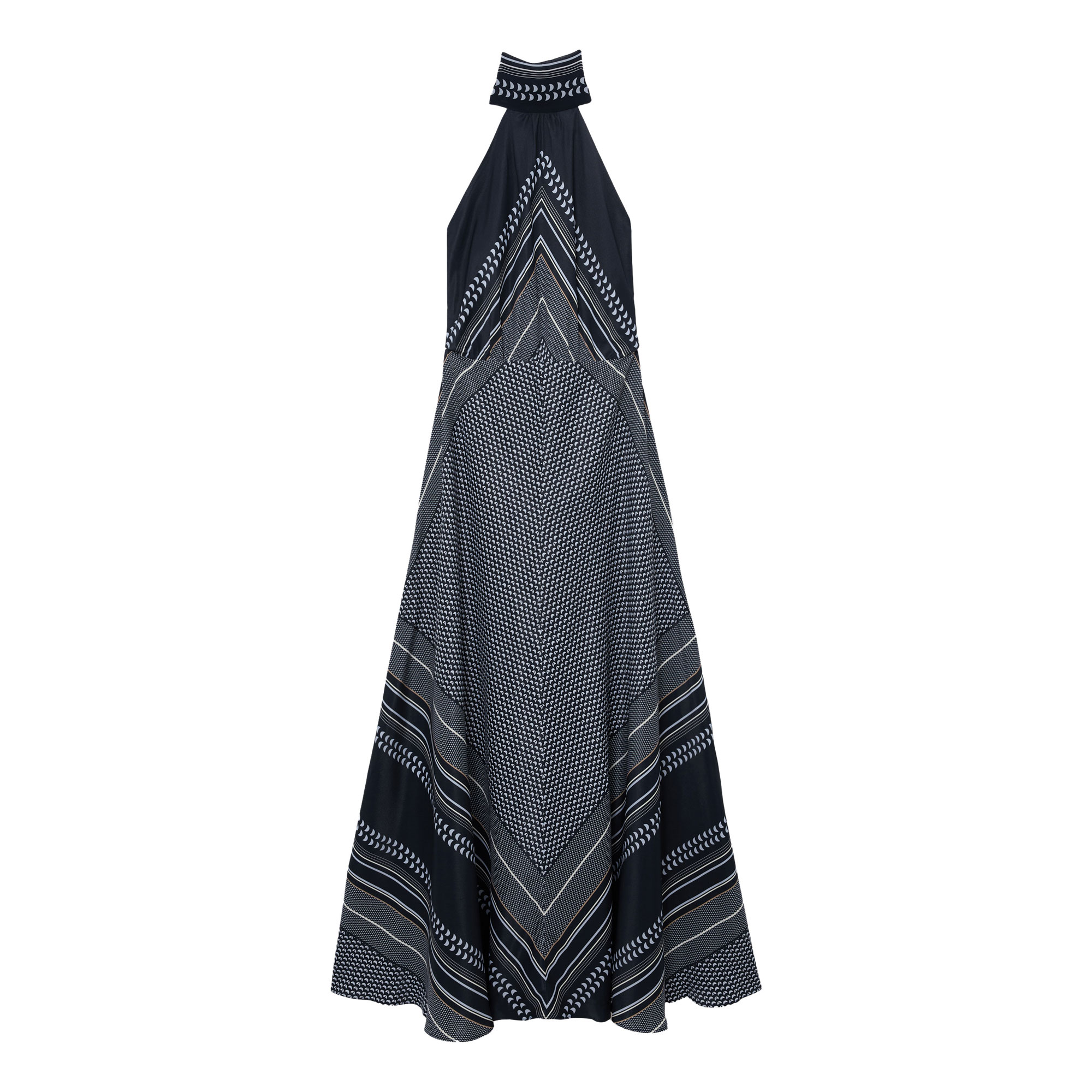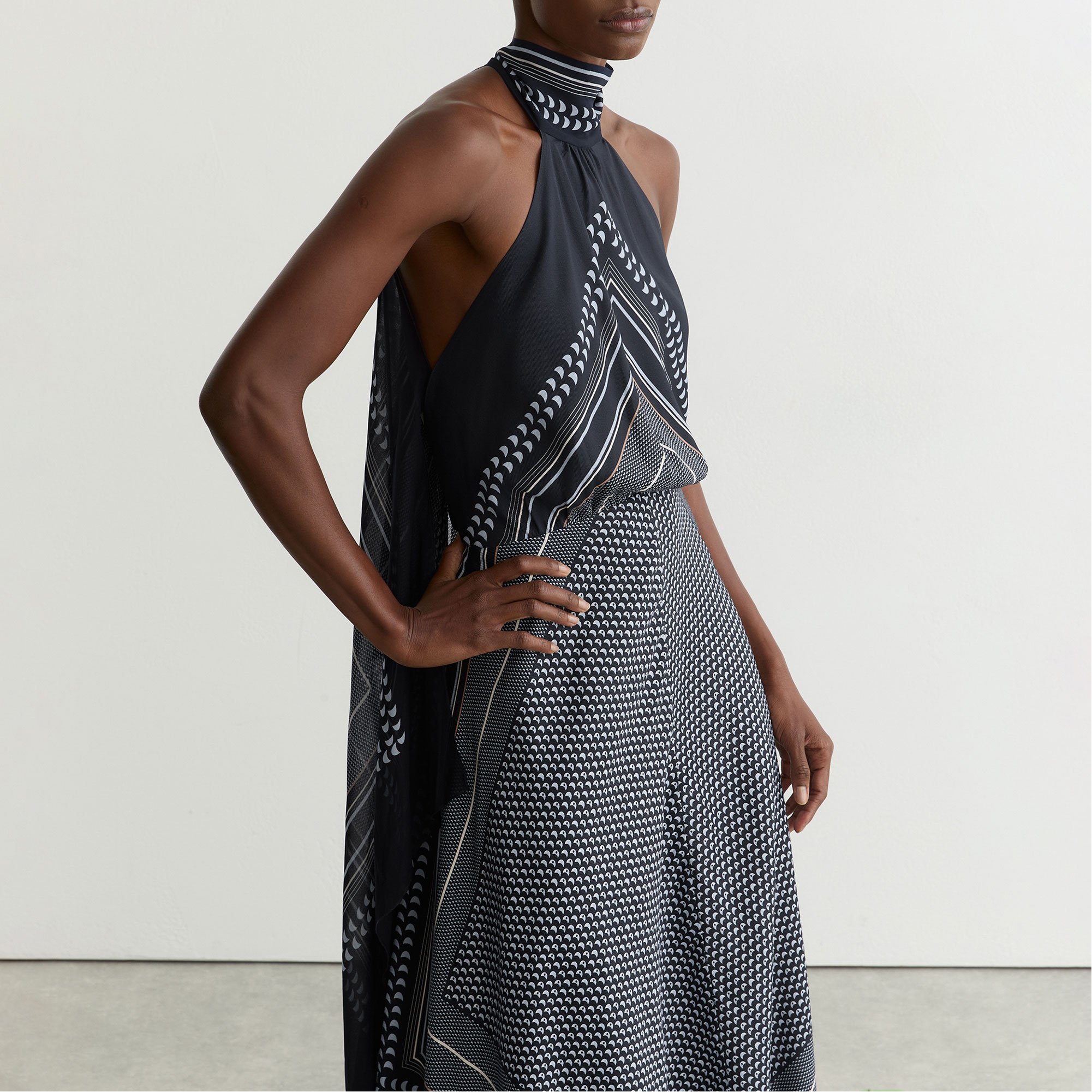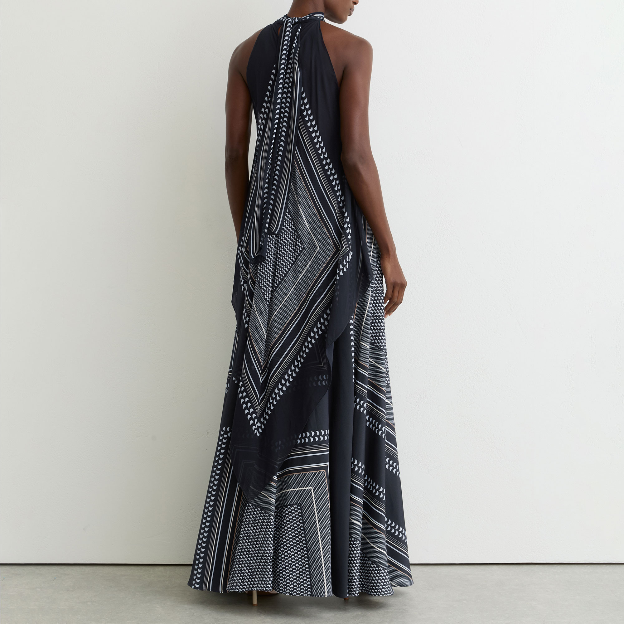 - Sleeveless, halter neck, back zip