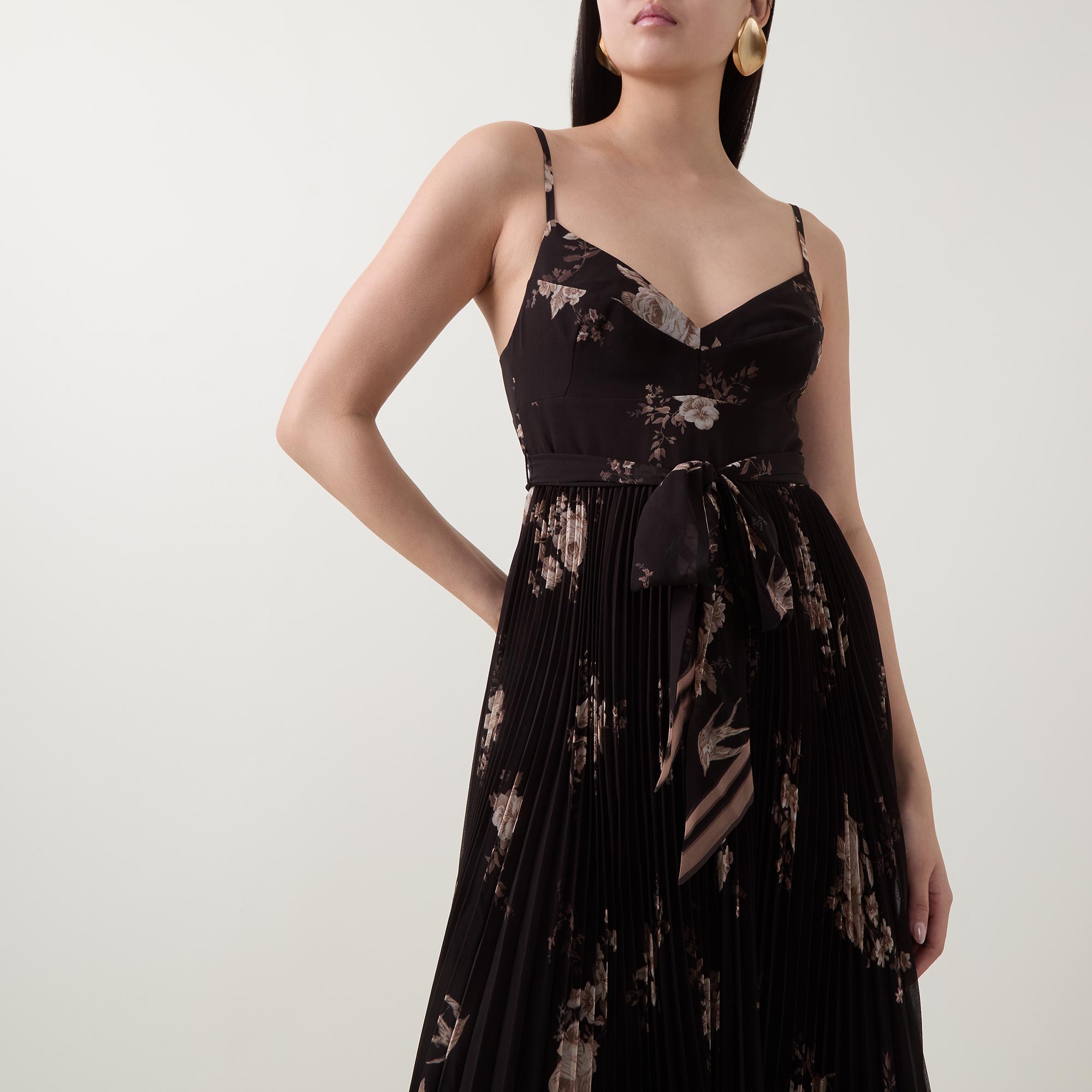 - Midi length, sleeveless, fixed shoulder straps, shirred centre back bodice with concealed zip fastening, waist belt with centre buckle, lined skirt, fitted bodice, flared and heavily gathered skirt, pleated structure, printed