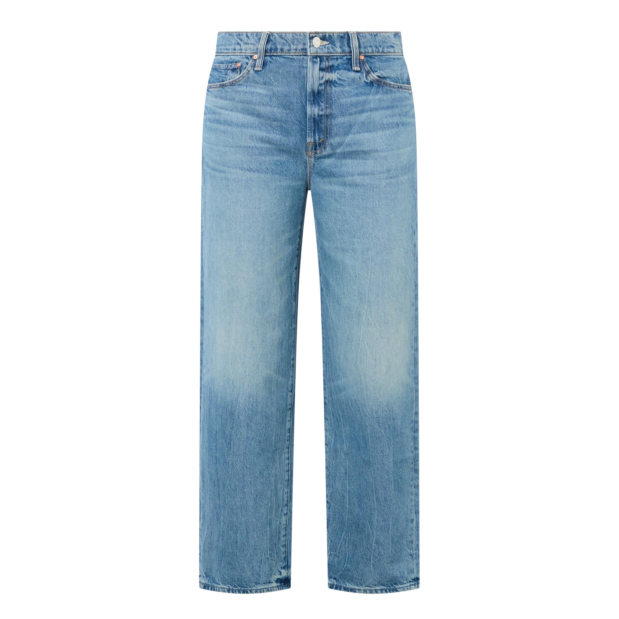 - Low rise, cuffed leg, straight leg, five pockets, zip and button fastening, faded and whiskering details