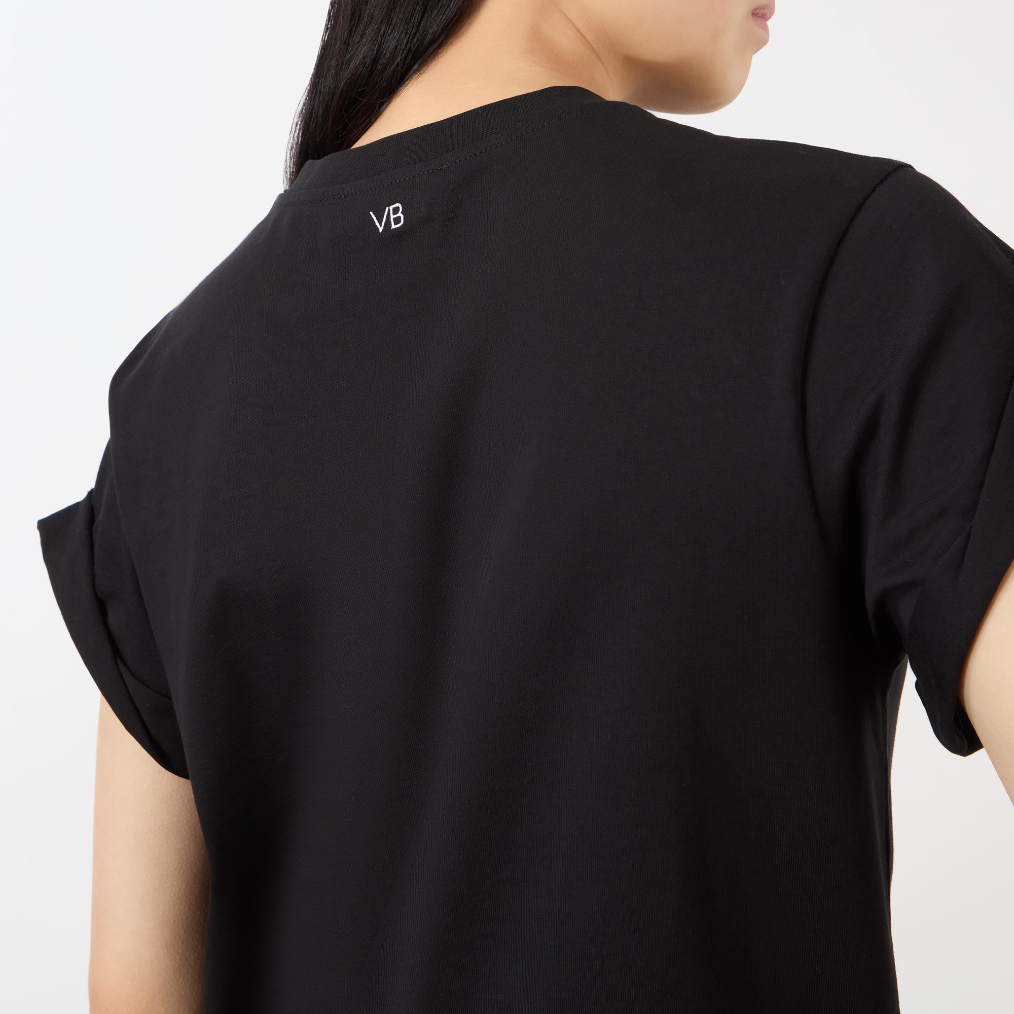- Round neckline, short sleeves with folded cuffs, straight hemline, contrasting monogram logo to the back