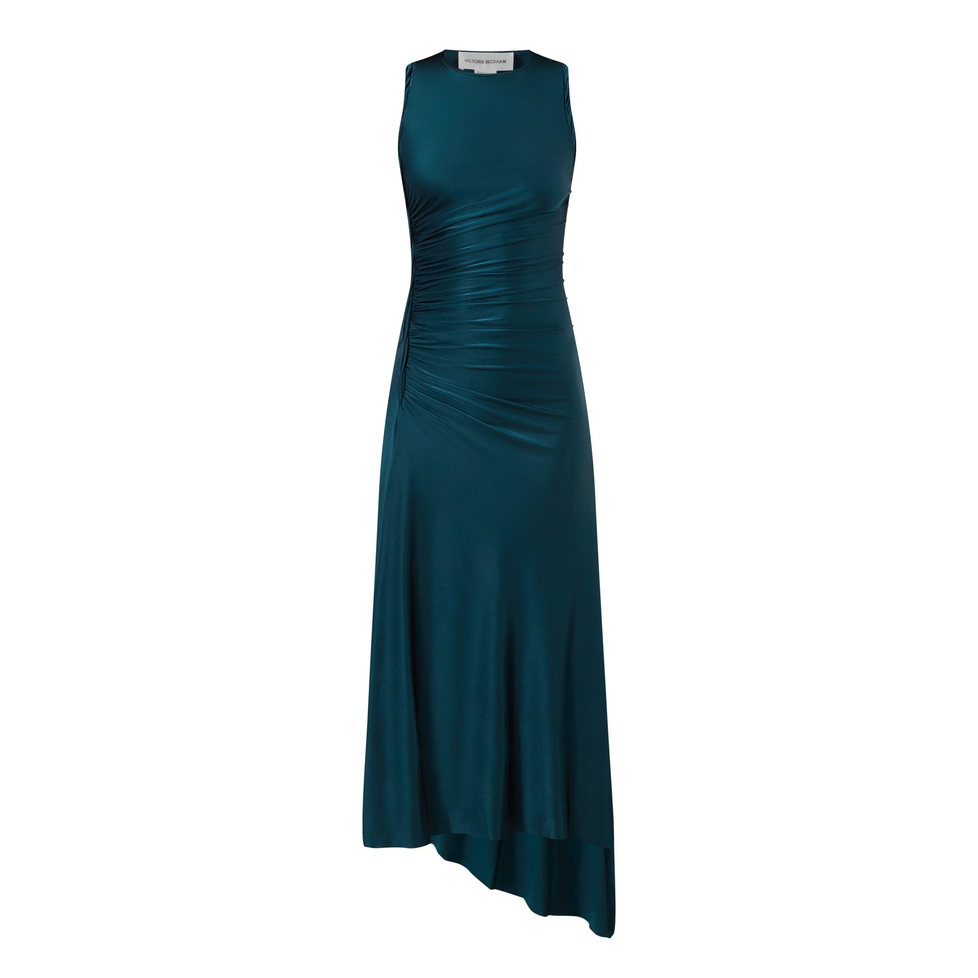 Twisted details and tactile ruching elevate a number of silhouettes across the latest Victoria Beckham collection, seen in the design of this dress. Cut from a high-shine jersey fabric, it features a round neckline before falling to an asymmetric handkerchief hemline.