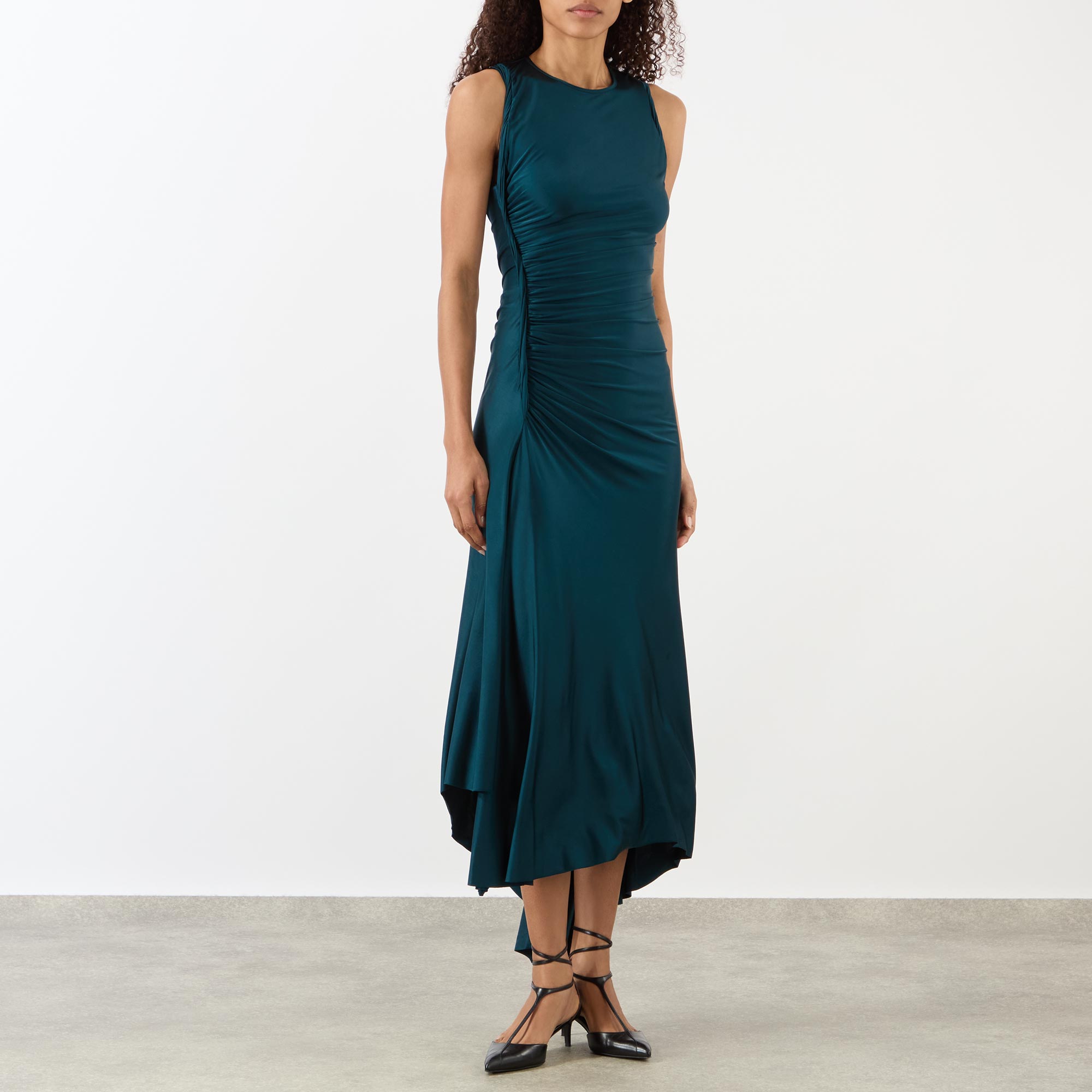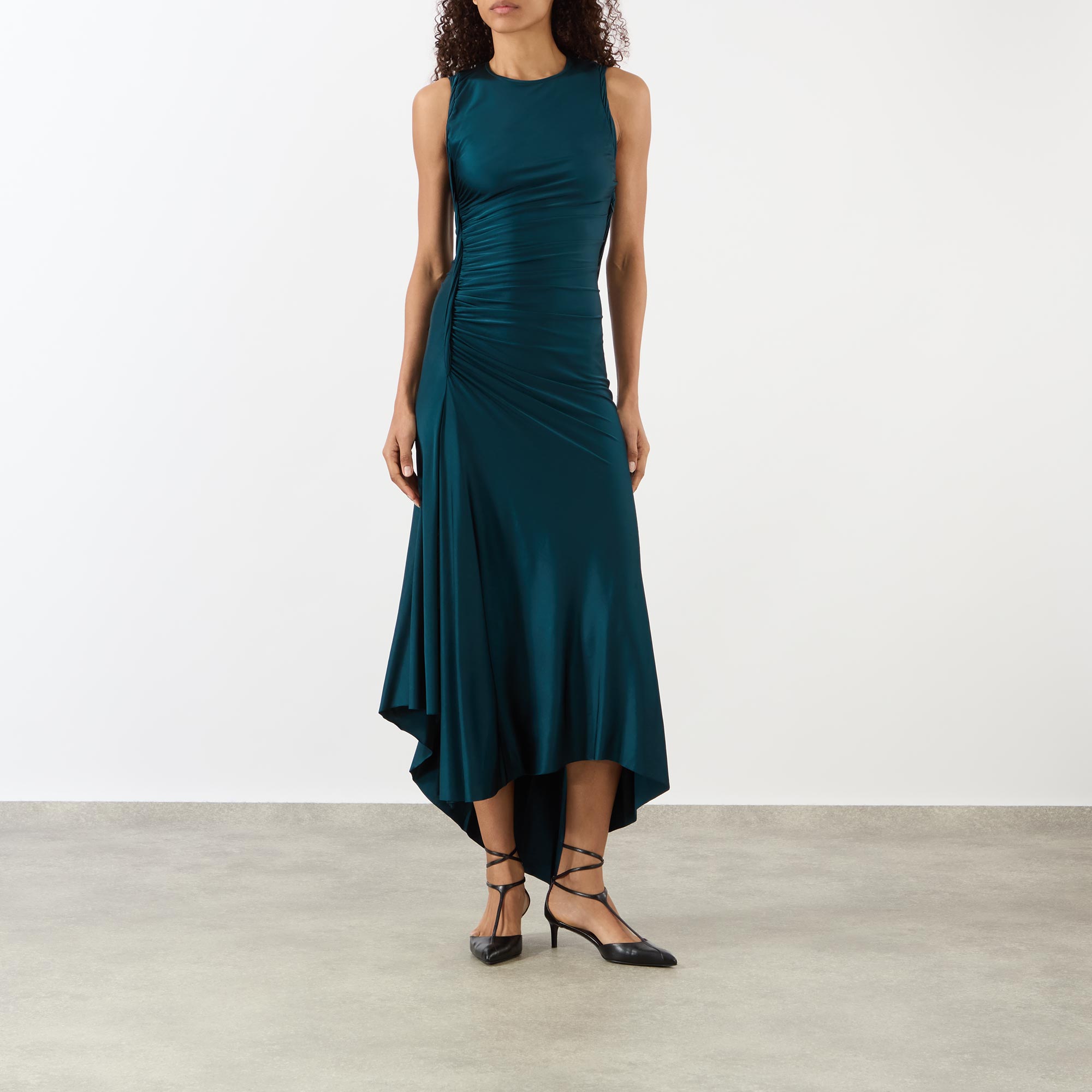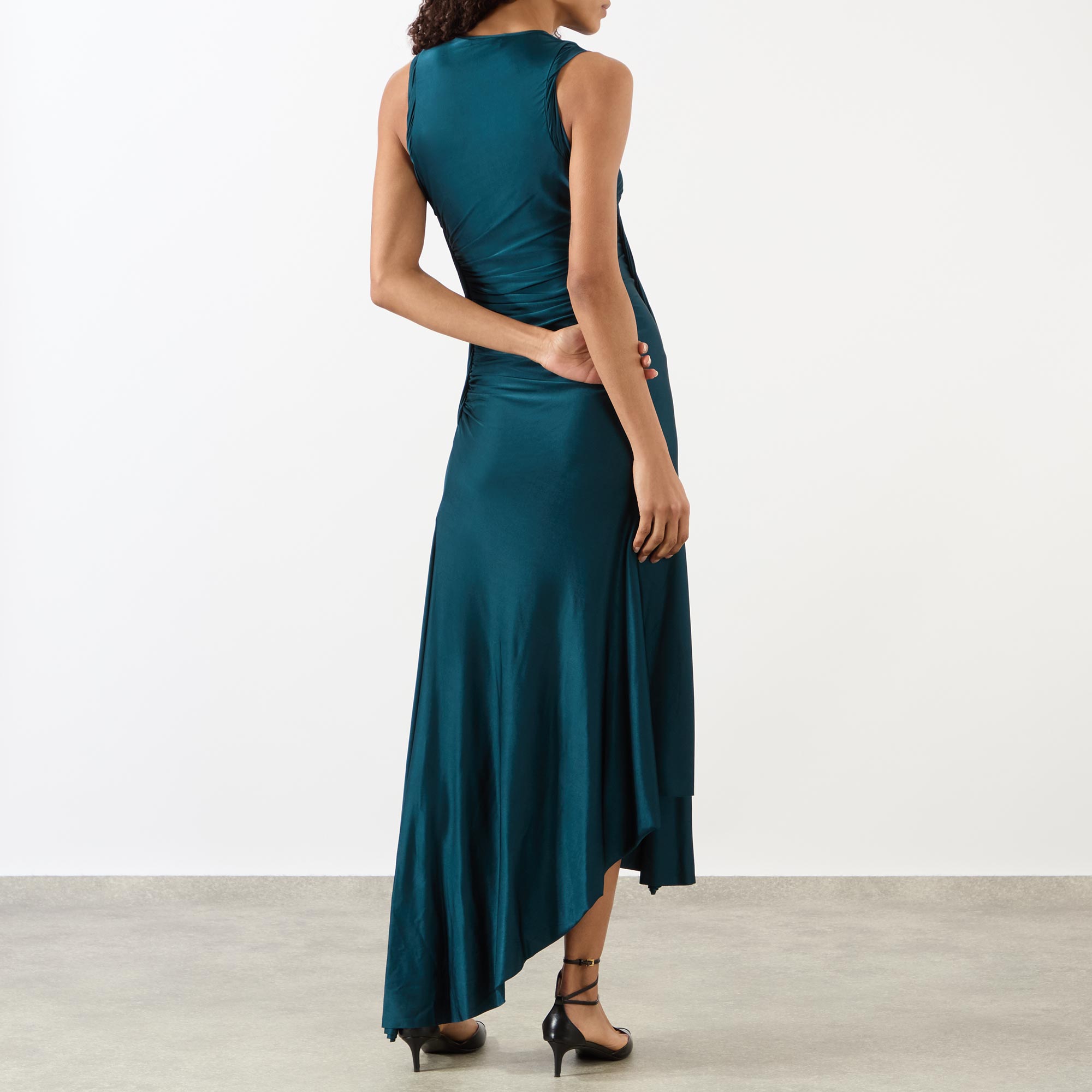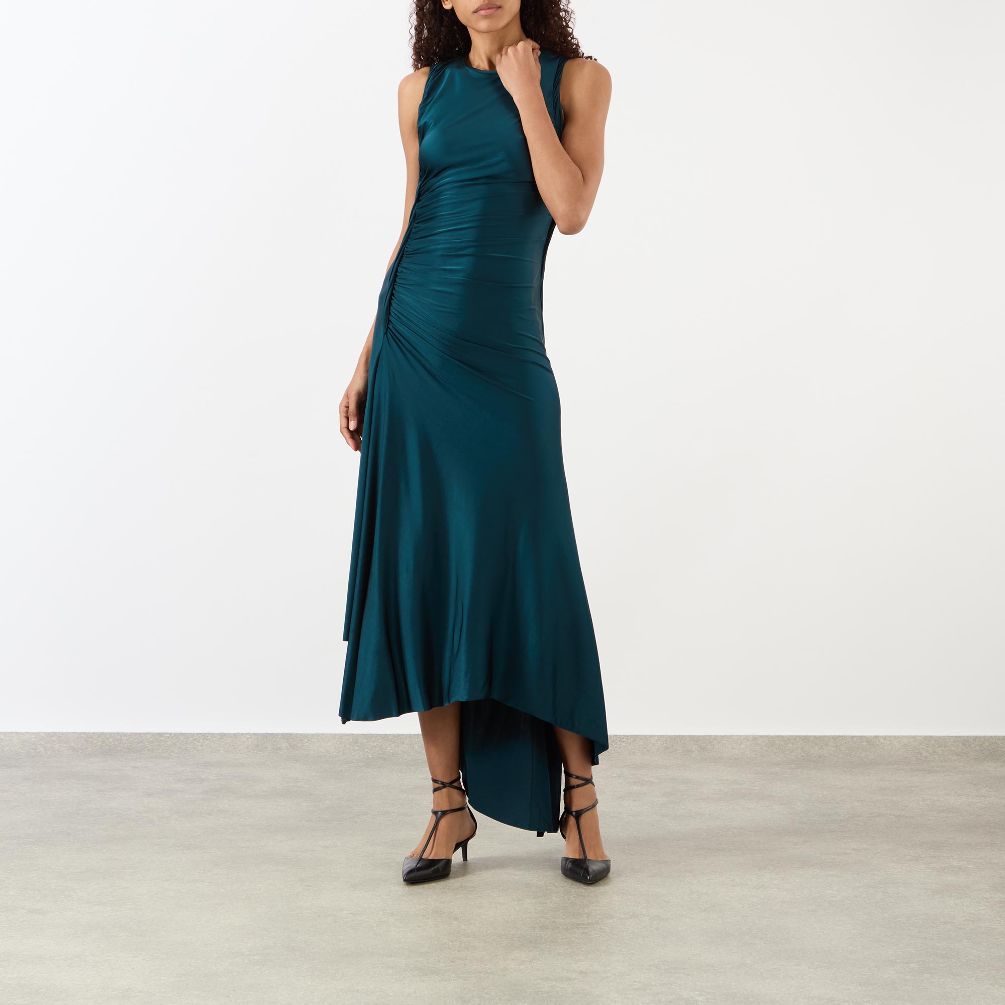 - Round neckline, sleeveless, midi length, asymmetric hemline, tactile ruched and twist details, high-shine fabric, concealed side zip fastening, slit side seam