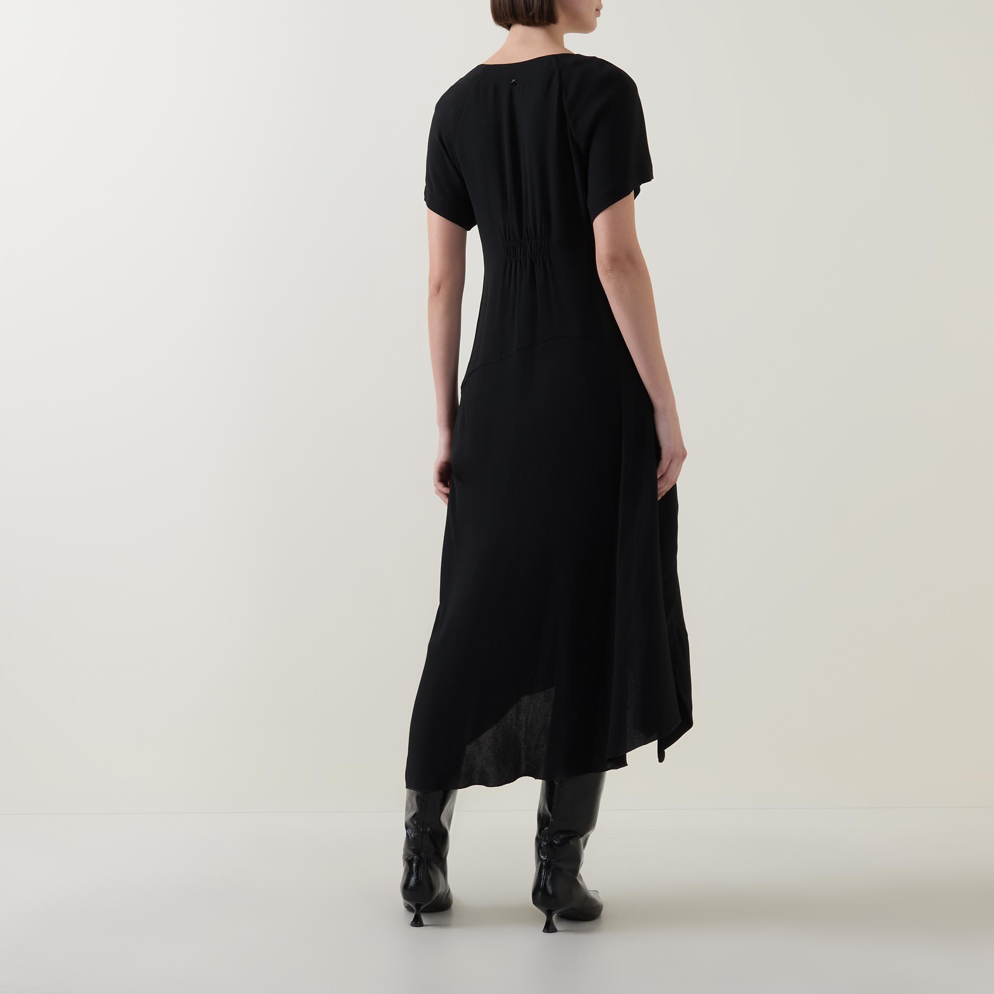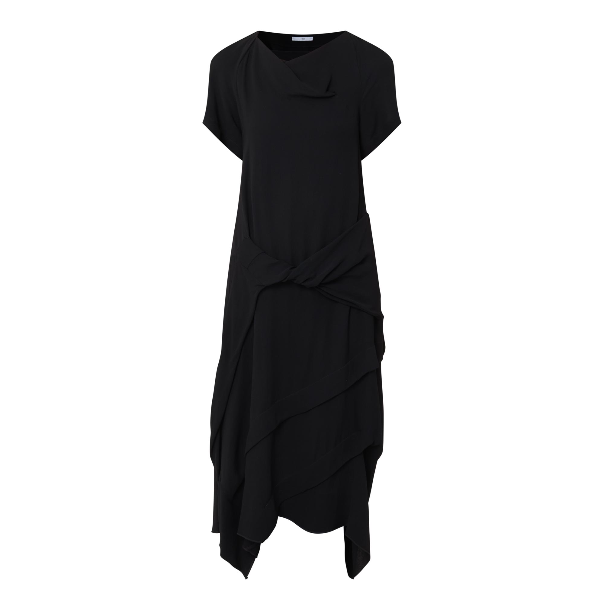 - Cowl neckline, short sleeves, midi length, asymmetric hemline, waist sash with twist detail, Swarovski® crystal detail to the back